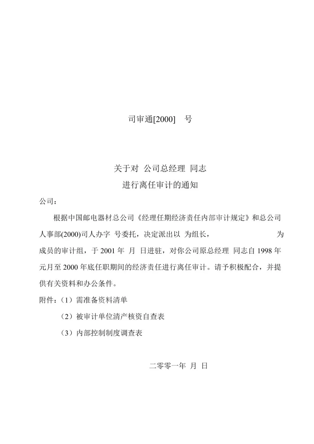 根据相关规定及委托,决定对公司原总经理同志1998-2000年任职期间经济责任开展离任审计,明确审计进驻时间及需配合提供的资料清单。