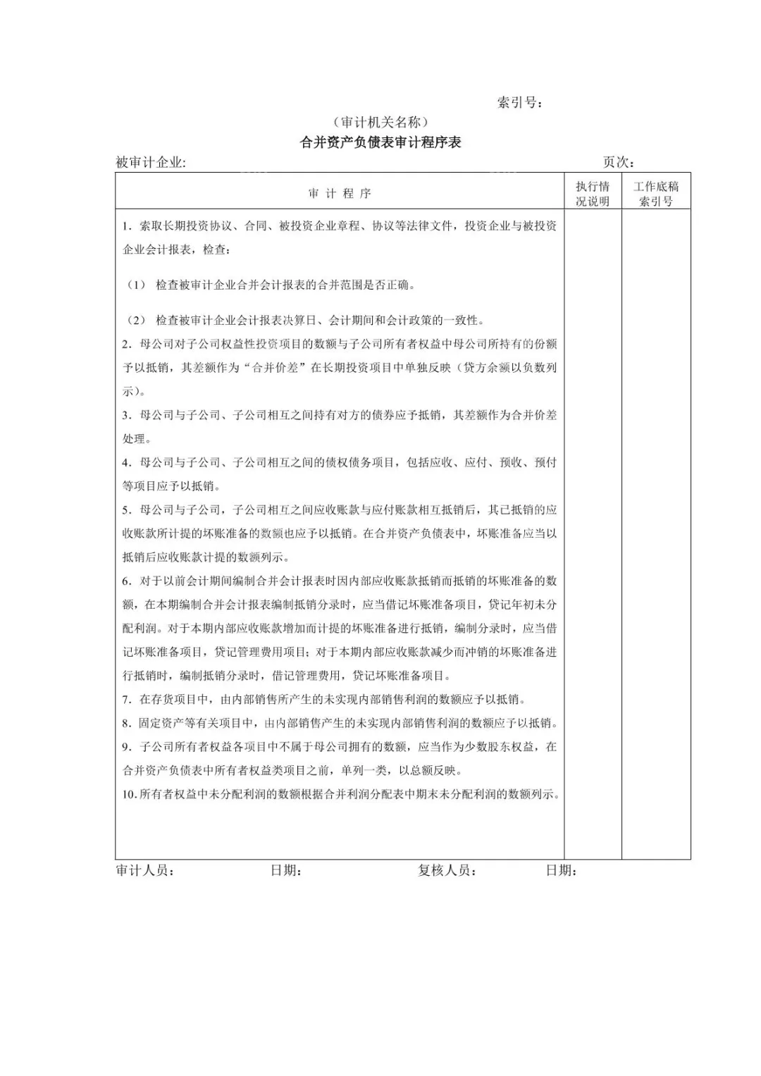 本文档为审计机关制定的合并资产负债表审计程序表,涵盖合并范围核查、内部交易抵销、少数股东权益列示等全流程审计操作规范,为审计人员提供专业执行指引。