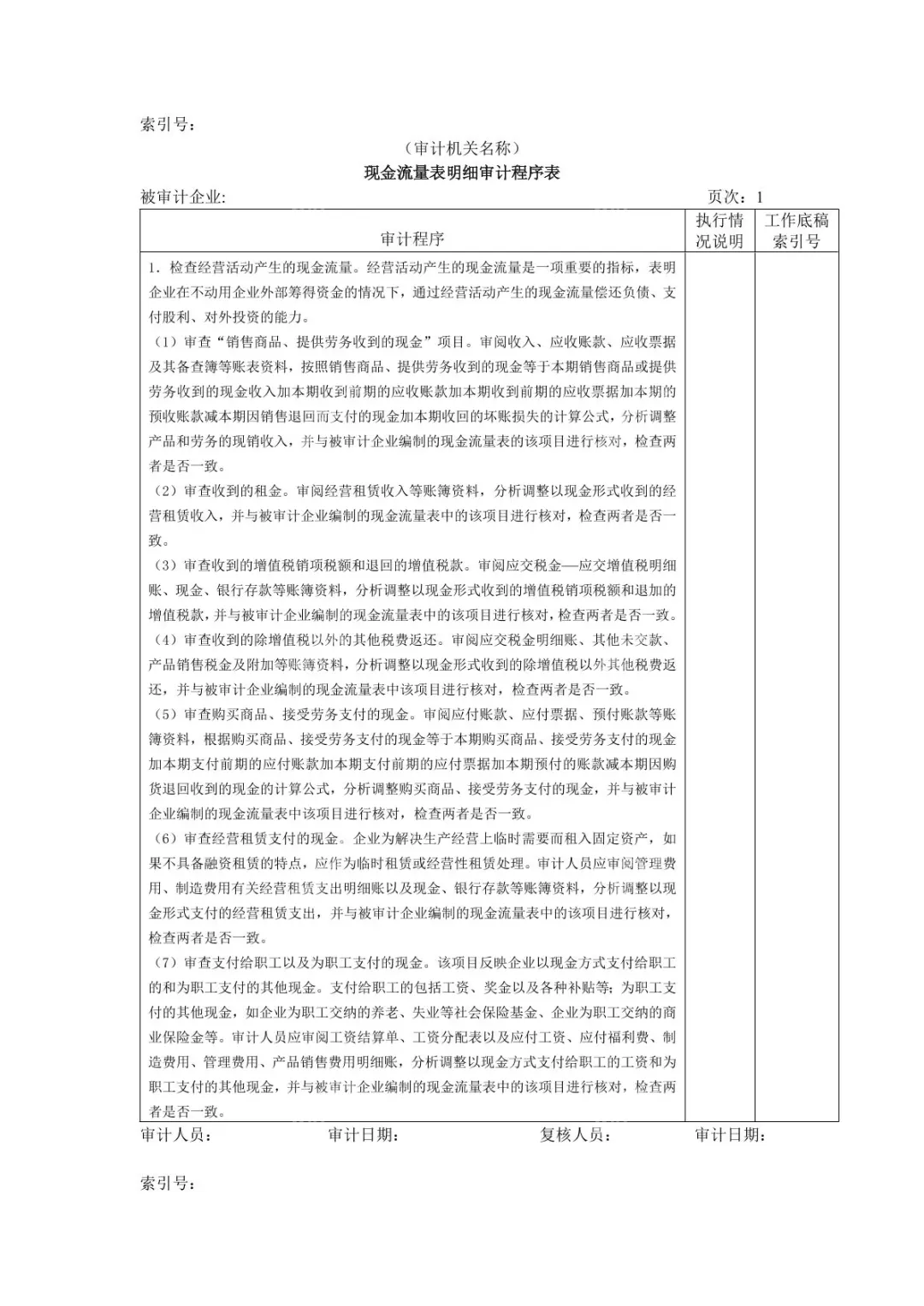 本审计程序表涵盖经营、投资、筹资活动现金流量的审计步骤,含各项目核对方法、补充资料检查等,为审计人员提供完整的现金流量表审计操作指引。