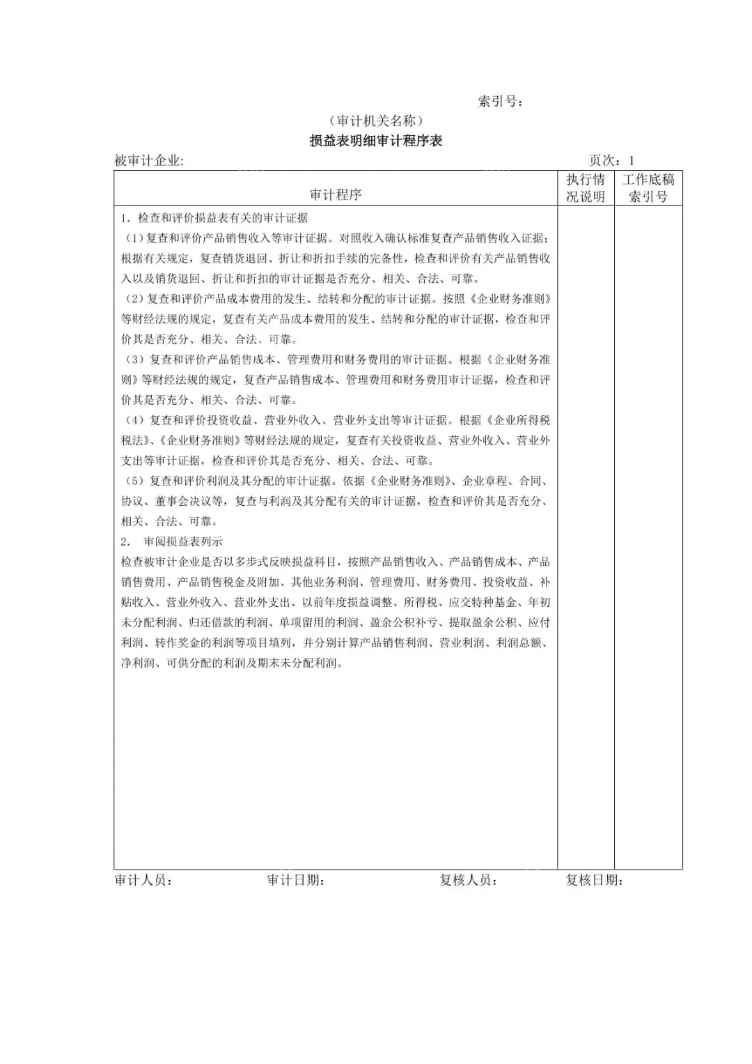 本审计程序表涵盖损益表相关审计证据核查、损益表列示审阅等全流程,明确收入、成本费用、利润分配等审计要点,为审计人员提供规范操作指引。