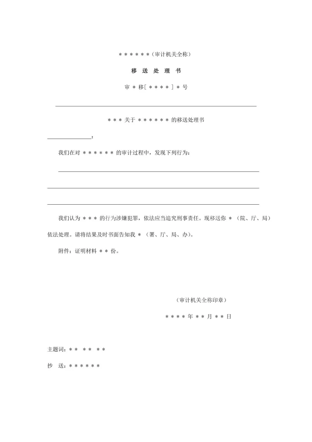 本文档为审计机关移送处理书标准范本,适用于审计中发现涉嫌犯罪行为,依法移送相关机关处理的场景,附证明材料报送要求。