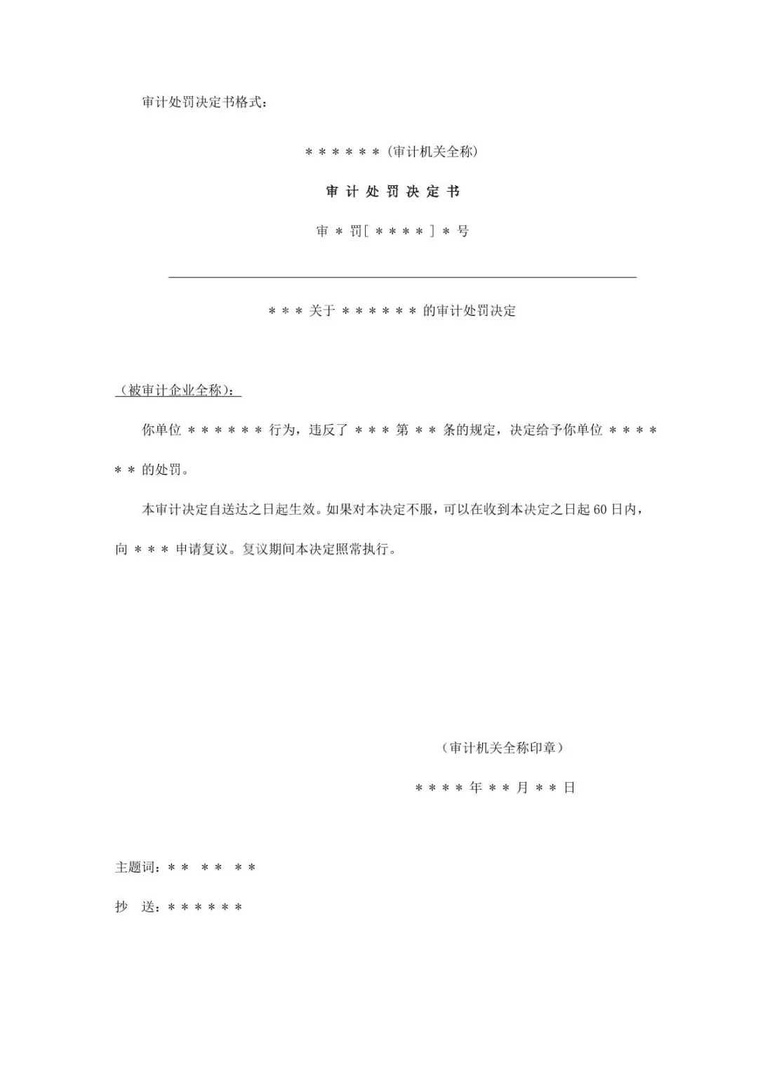 本文档提供审计处罚决定书的标准格式模板,包含文号、处罚内容、复议说明等完整要素,适用于审计机关规范出具处罚文书。