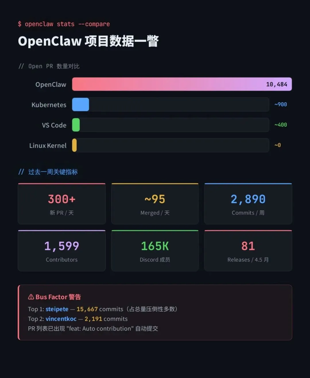 作为参照——Linux kernel 的 open PR 基本为零(走 mailing list),Kubernetes 大约维持在 800-1000 个,VS Code 大约 400 个。OpenClaw 的 1 万多个 open PR 是一个非常不寻常的数字。