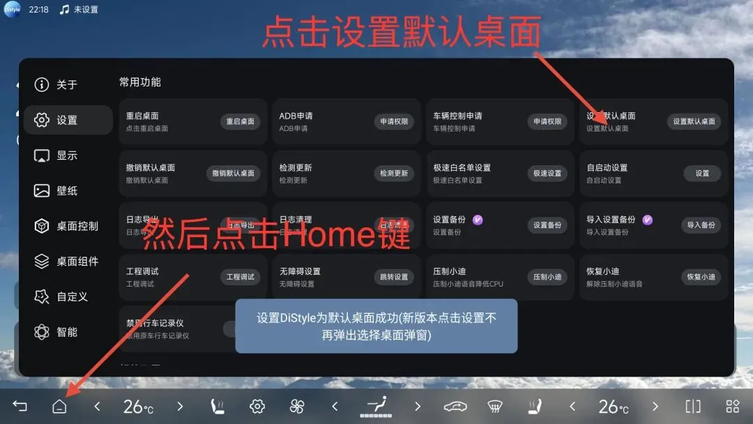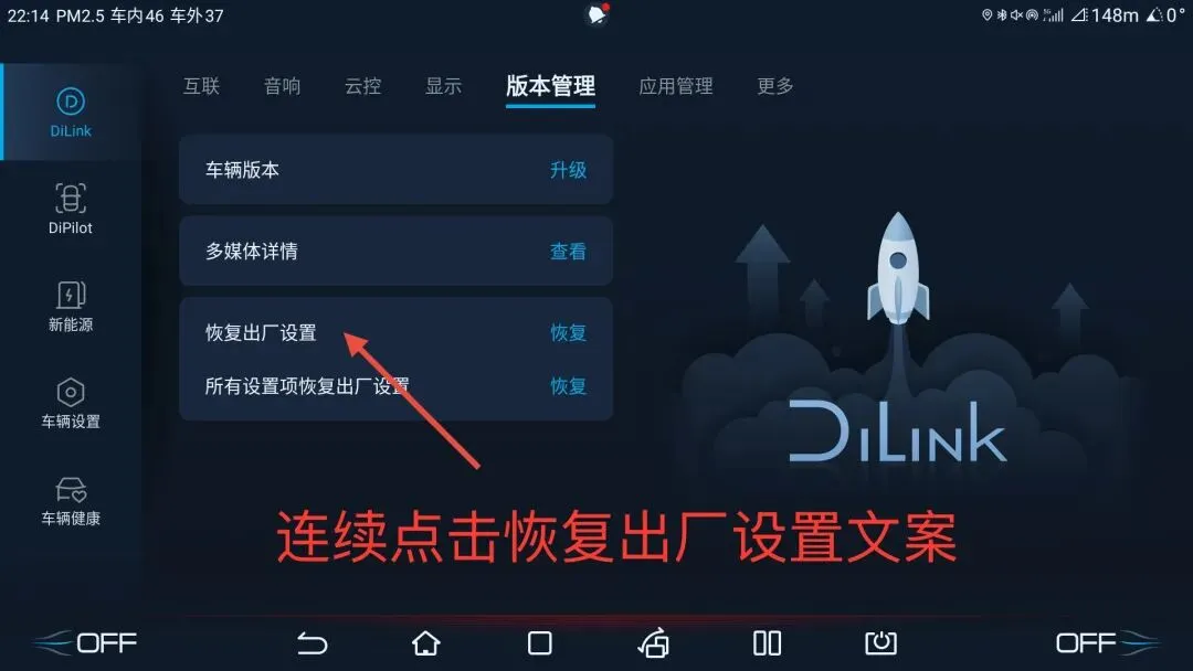 在车机系统桌面找到并打开车辆设置 ==> 选择DiLink分类 ==>选择版本管理分类 ==>快速连续点击"恢复出厂设置"文字(注意⚠️⚠️⚠️⚠️不要点击恢复按钮)。