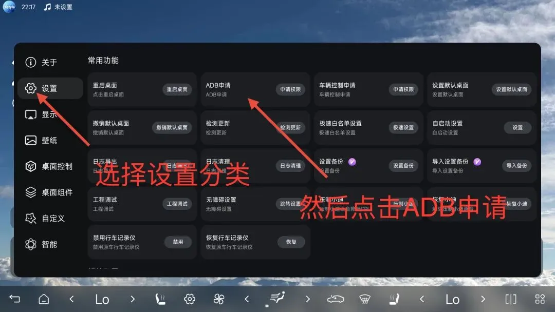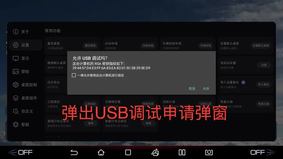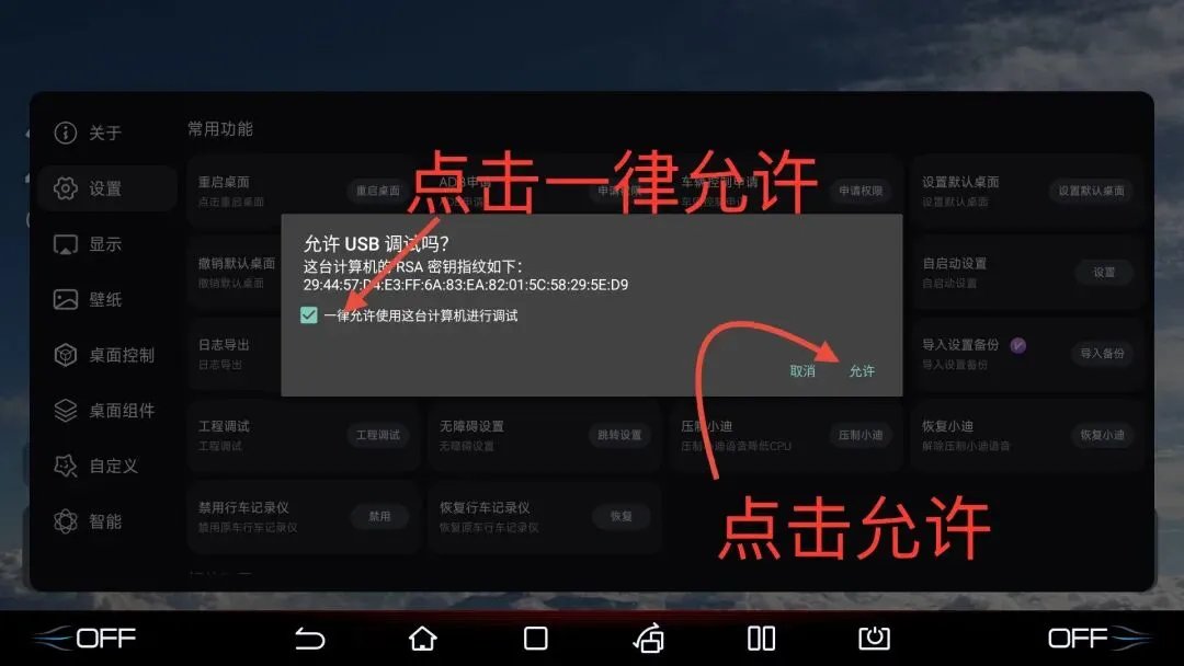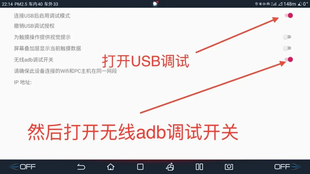 首先打开车机系统USB调试开关和无线ADB调试开关
