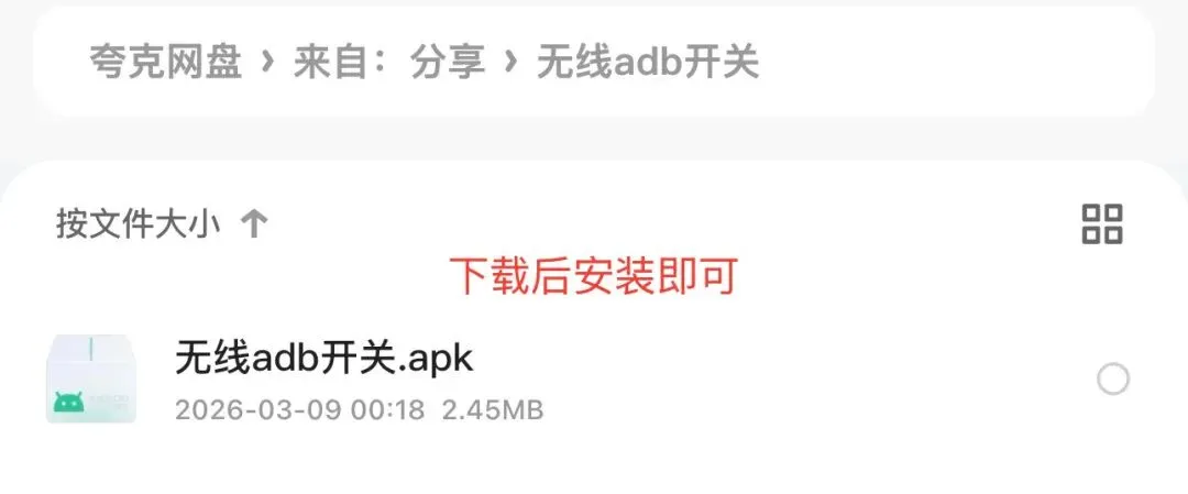 "无线adb开关"安装后默认不会出现在桌面上无法打开,安装成功后去重新操作步骤一即可