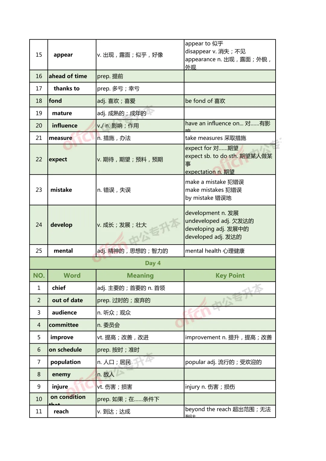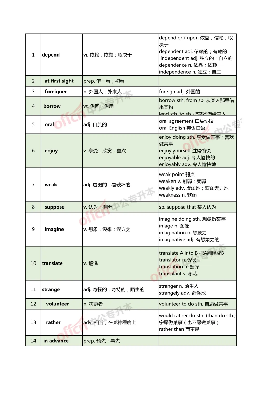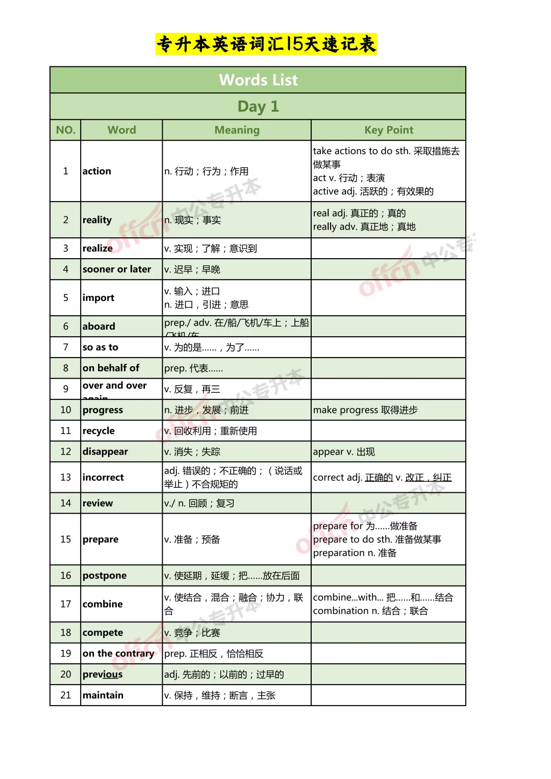 专升本最后复习阶段要不要继续背单词?这是最近很多考生在问橙子的,在这要说的是,你一定要坚持去背单词哦,词汇量的多少与你英语成绩有很直接的关系,特别是阅读理解题、翻译题、写作题,所以在这给大家分享一个最后15天可以用到的专升本英语核心词汇15天速记表↓