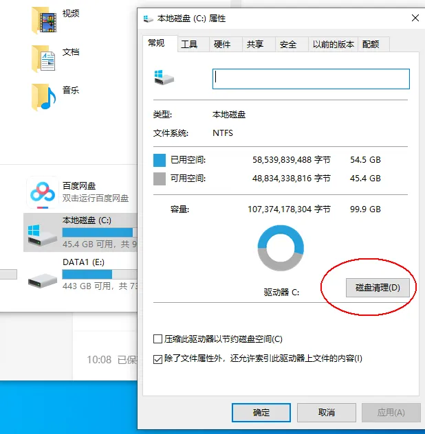 在弹出窗口中点击 “磁盘清理”;