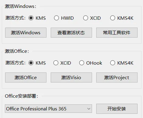 在工具的界面中带有windows激活、office激活以及office安装部署三个功能。