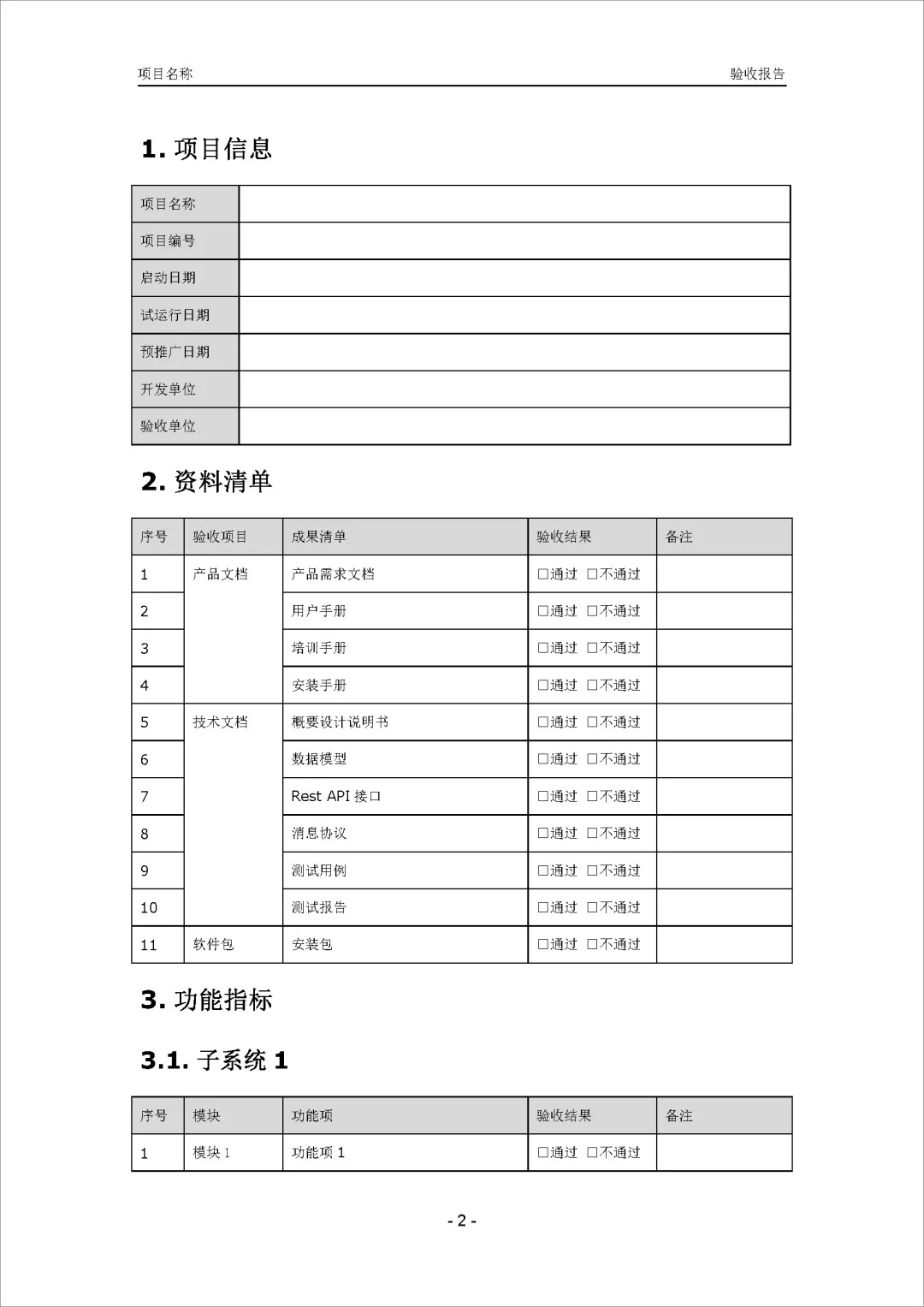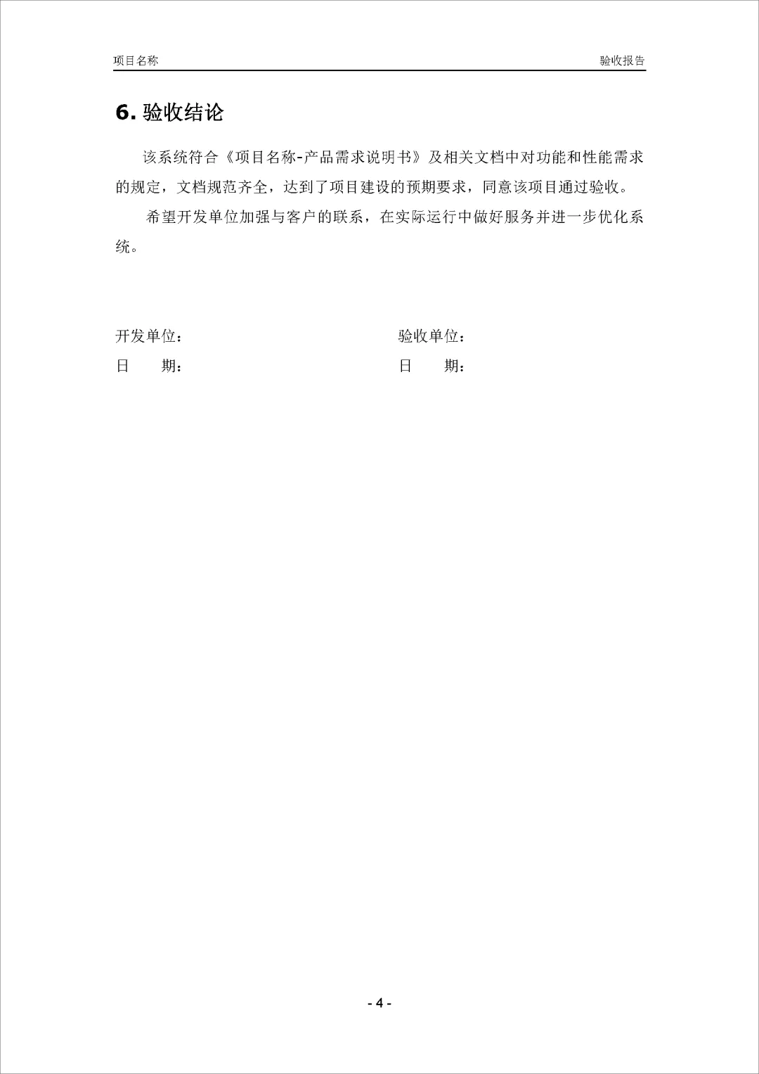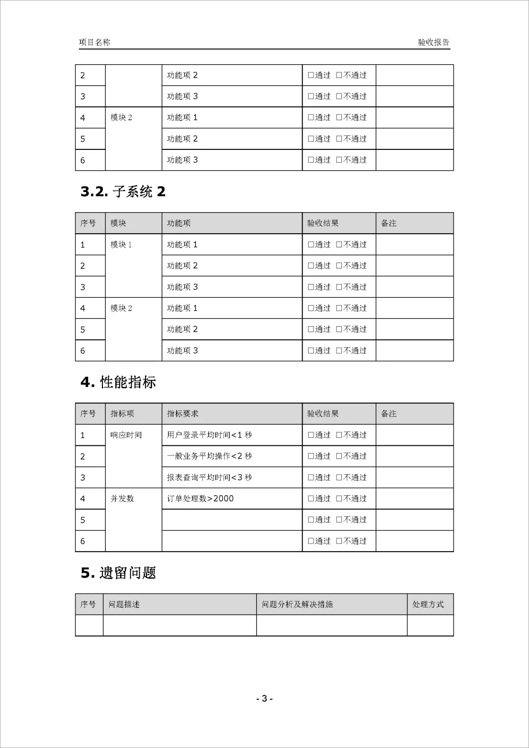 验收报告用于总结项目的验收情况,包括项目信息、资料清单、功能指标、性能指标、遗留问题和验收结论等内容。通过这份报告,可以清晰了解项目各项指标的验收情况,包括文档齐全性、功能和性能的达标情况,以及存在的遗留问题。最终的验收结论确认了系统符合需求并通过验收,同时提出了改进建议,为项目的后续优化提供了指导。这份报告对于评估项目的整体质量、决定是否通过验收以及后续改进方向都具有重要意义。