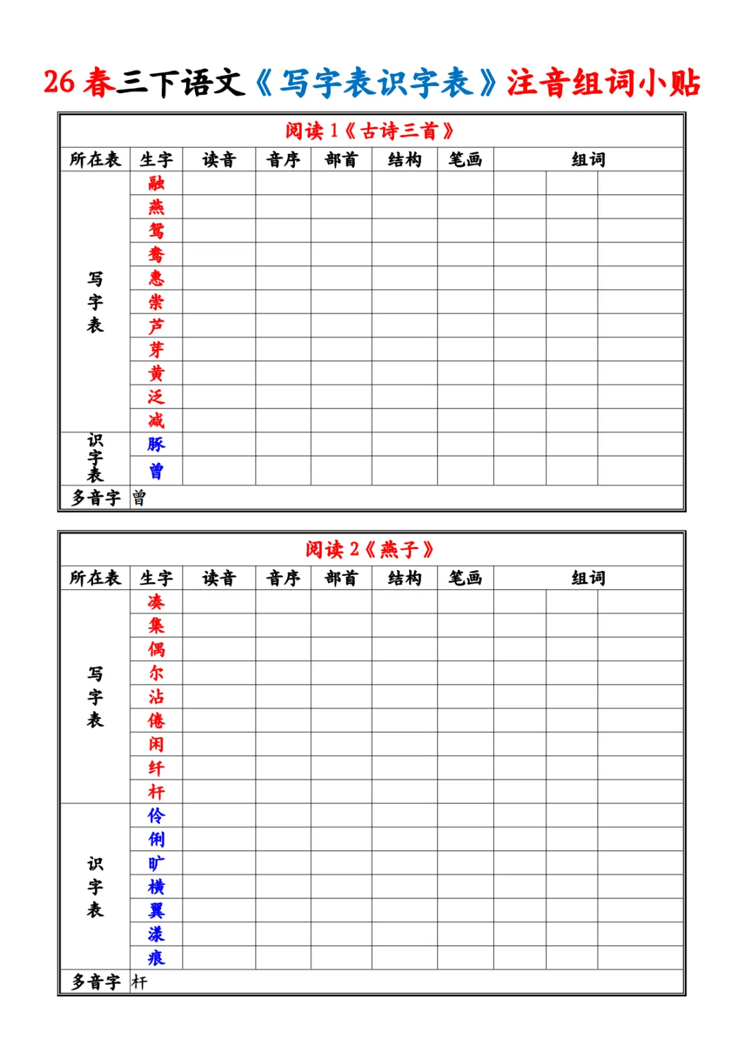 三年级(下)语文 26春《写字表识字表》注音组词小贴