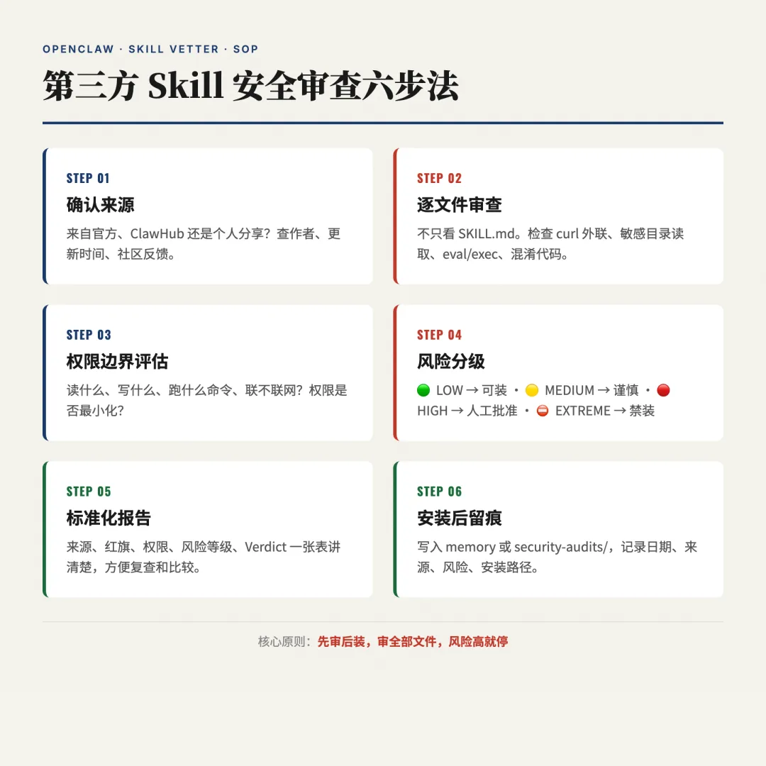 如果要把 Skill Vetter 落成团队或个人标准,我建议把流程固定成下面这 6 步。
