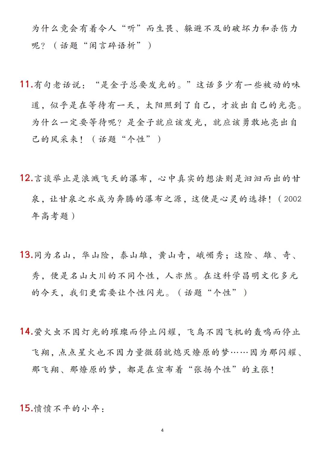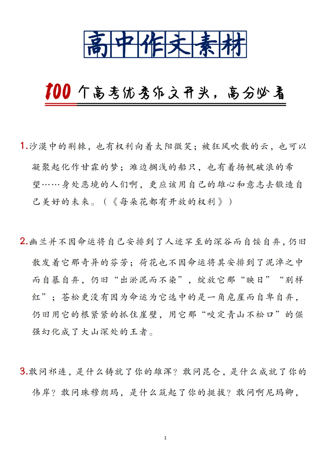 高中语文作文100个优秀开头,限时下载!我用夸克网盘分享了「【极品】高中作文素材.pdf」,点击链接即可保存。打开「夸克APP」在线查看,支持多种文档格式转换。链接:https://pan.quark.cn/s/b7aec1a44f2e
