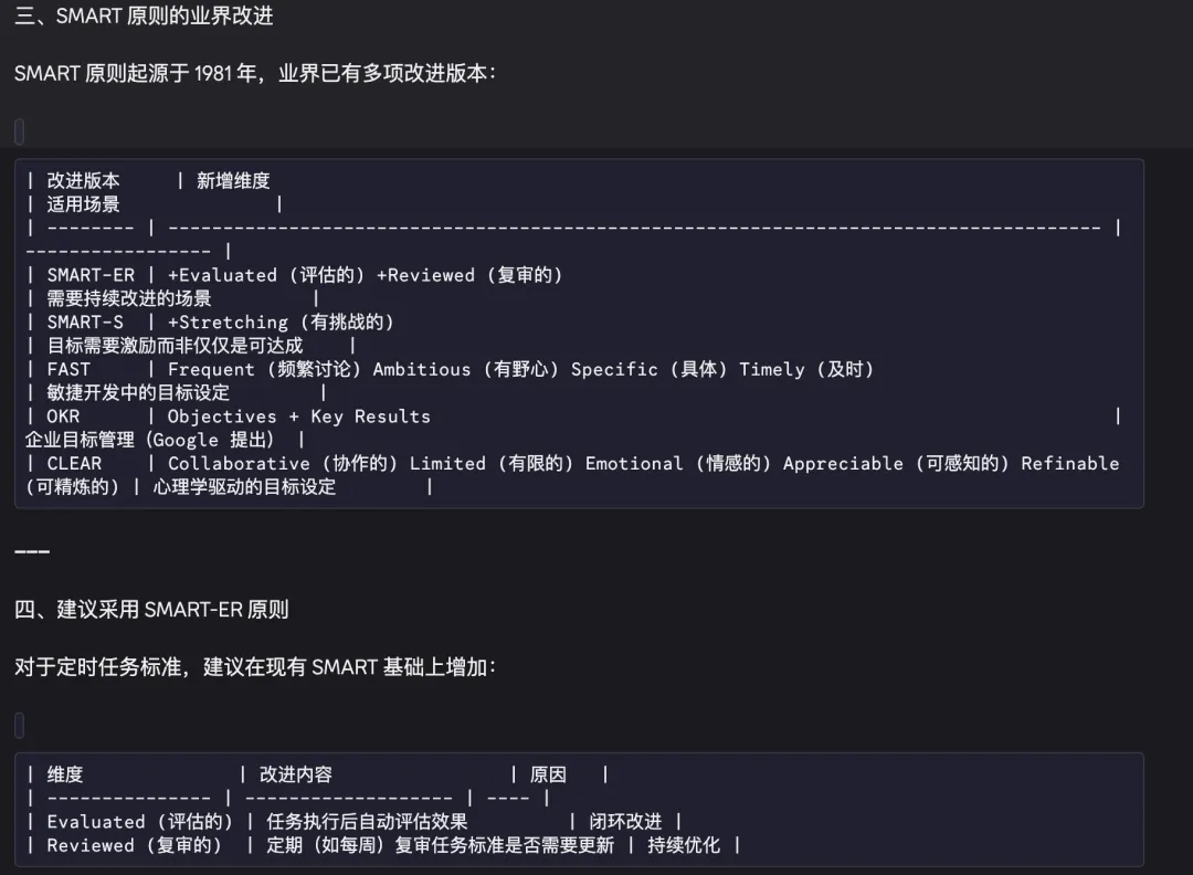 业界有对 SMART 原则的改进,也有其他行之有效的任务管理实践,那么就可以问下 openclaw:业界是否有对 SMART 原则的改进,并应用到定时任务标准的制定这样可以得到如下的内容,基于 AI 来学习和应用任务管理最佳实践,并即时应用于手头的任务管理中: