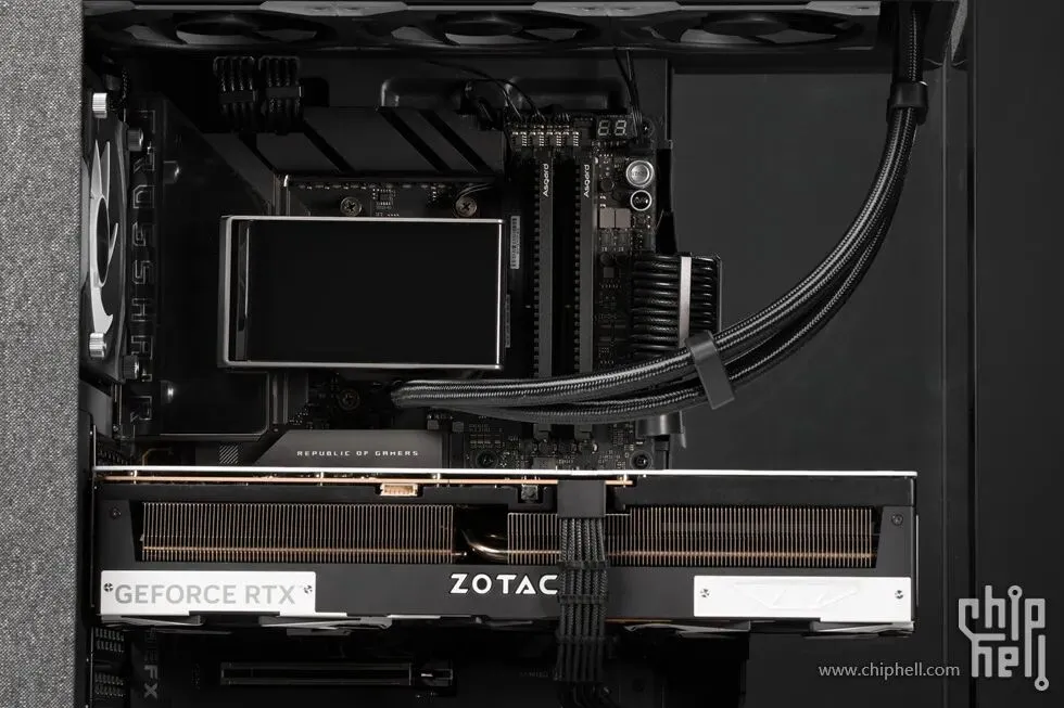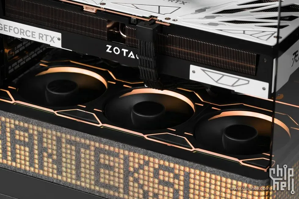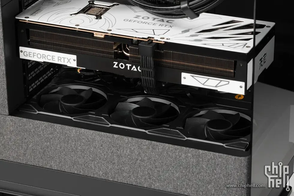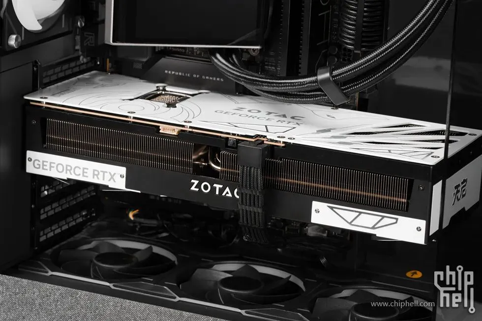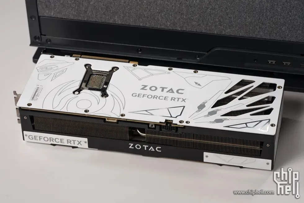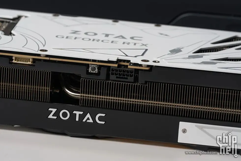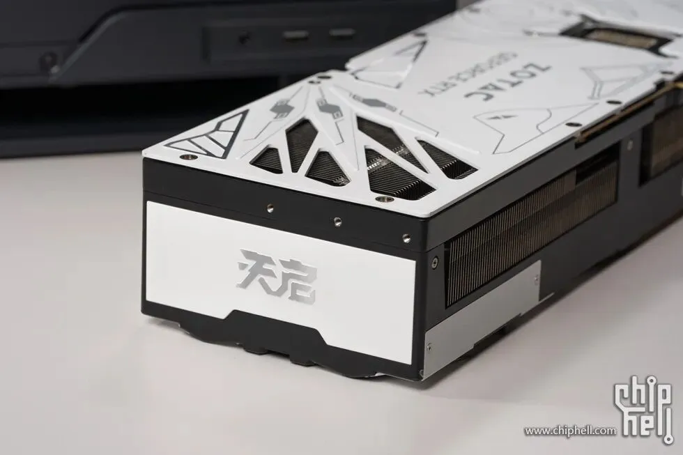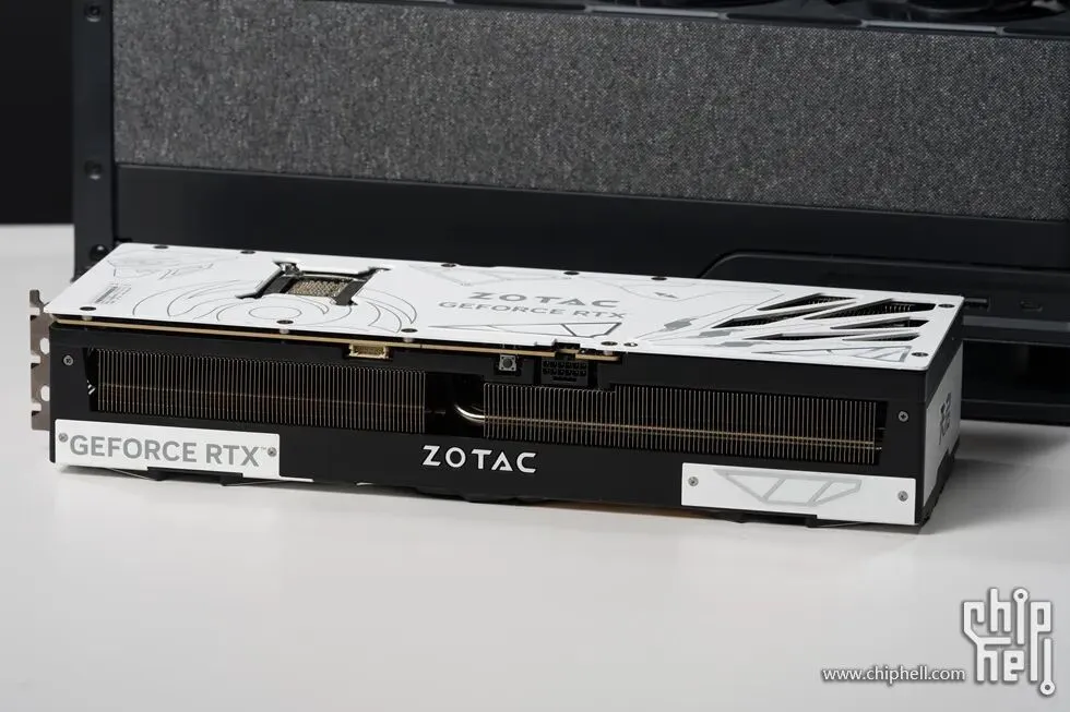 显卡背板为纯白铝合金全覆盖设计,上面印有ZOTAC LOGO标识与机甲线元素设计