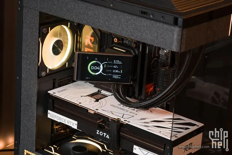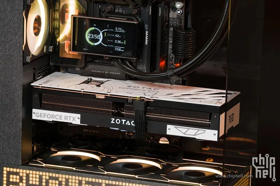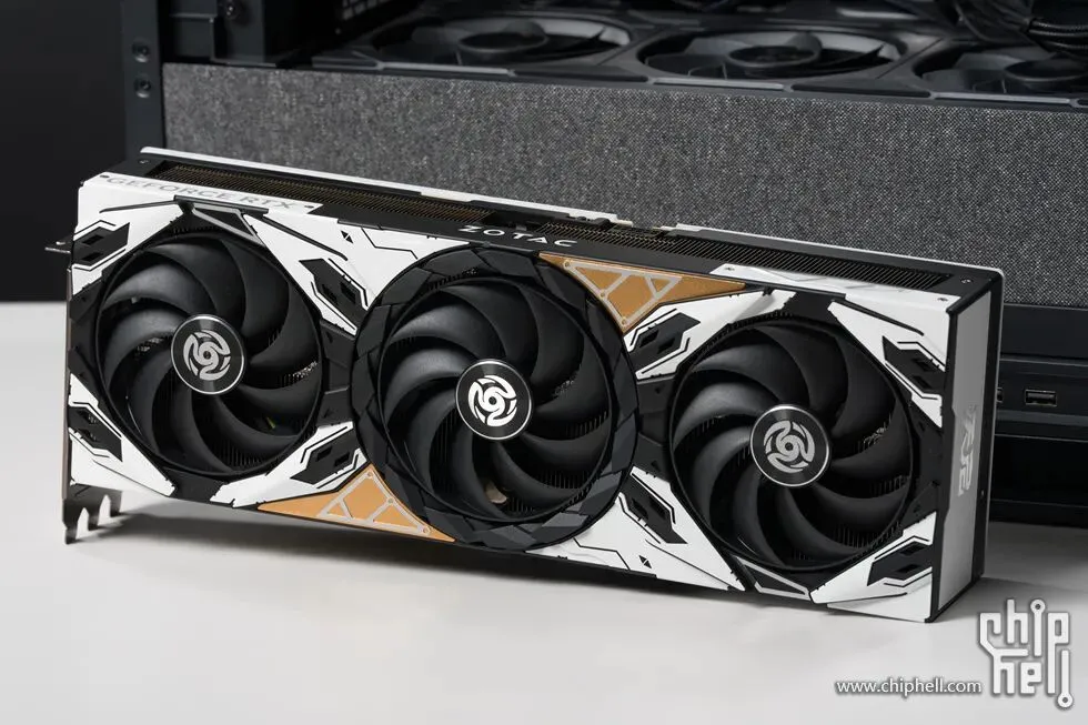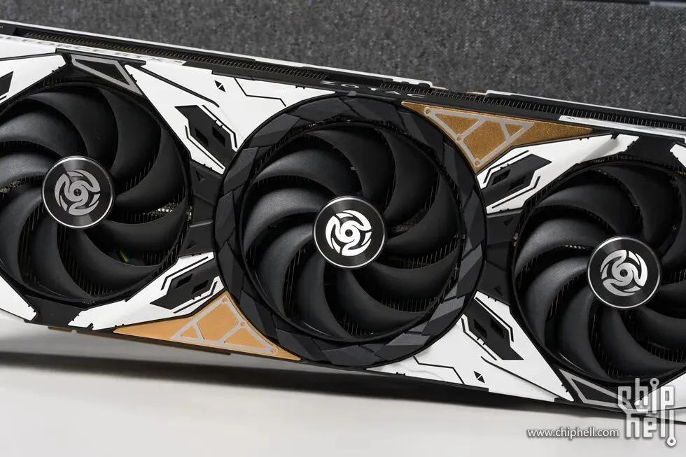 显卡外观为纯白机甲风金属外壳,边缘点缀金色饰件,黑白撞色搭配非常契合本次装机风格