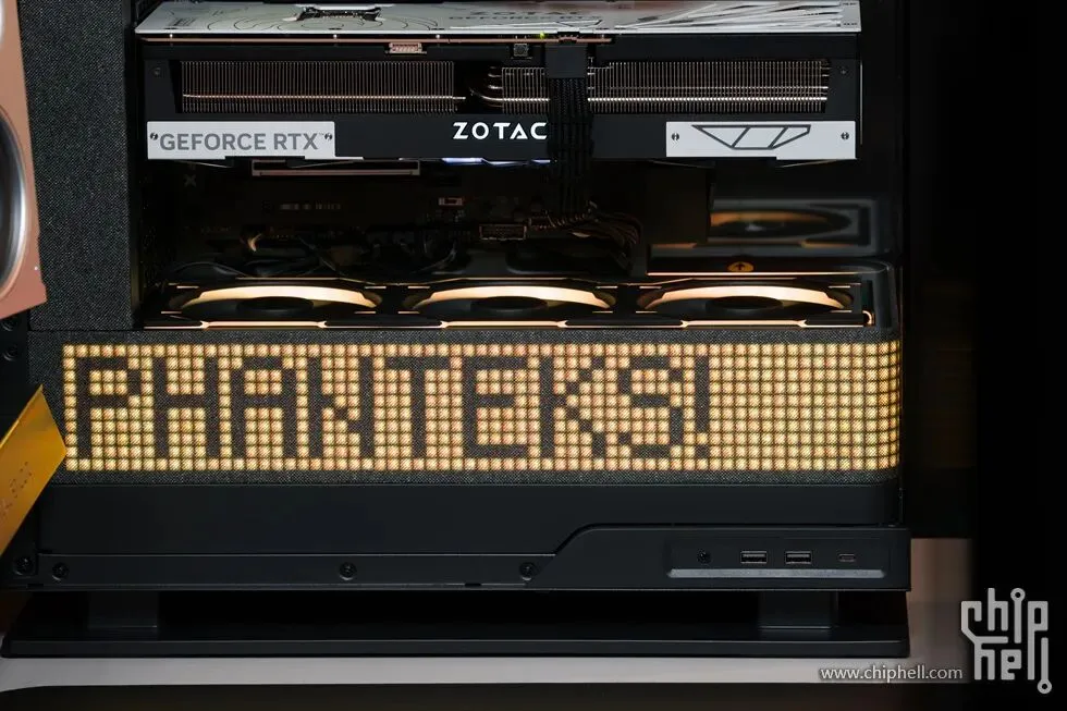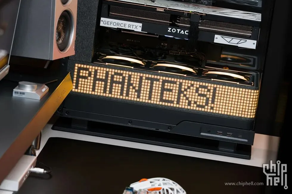 本次装机核心——追风者 EVOLVE X2 MATRIX 像素机箱,最引人注目的,便是底部电源仓区域加装的超长像素矩阵灯板,这也是其“像素版”命名的由来。灯板由900颗可独立控制的LED灯珠组成,采用独特的90度转角设计,巧妙隐藏在精致的聚酯布艺内饰边框之后,实现“玩屏不见屏”的通透质感——关机状态下,布艺面板平整简约,与三面钢化玻璃、金属机身浑然一体,丝毫不见灯珠痕迹;开机瞬间,900颗灯珠同步点亮,光线透过布艺扩散,柔和且富有层次感,既避免了传统RGB灯效的刺眼感,又能呈现出极具科技感的动态视觉效果,让每一次开机都成为一场专属视觉盛宴
