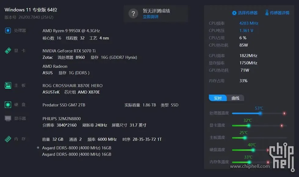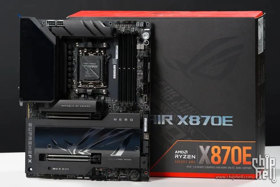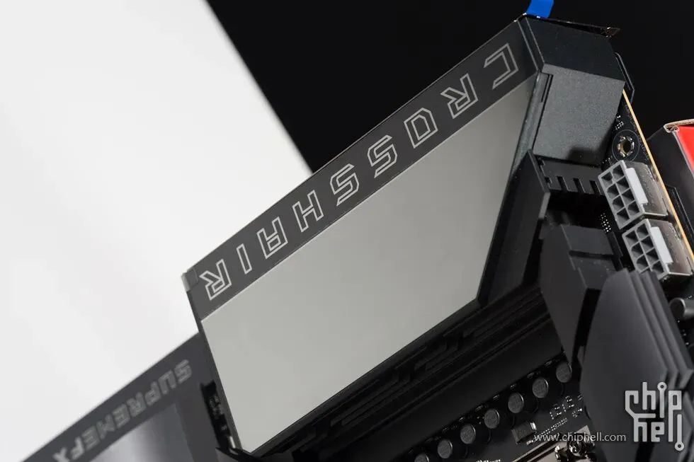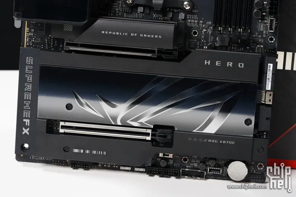 主板来自ROG CROSSHAIR X870E HERO,作为华硕旗舰级X870E ATX板型,正面融入ROG镜面元素及“CROSSHAIR”“SUPREMEFX”标识,支持AURA SYNC灯效