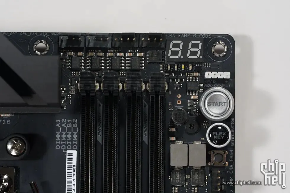 主板右上角为4个4PIN风扇接针以及主板Q-LED故障灯以及Q-CODE数字灯,旁边还有start开机键以及自定义FLEX KEY按键