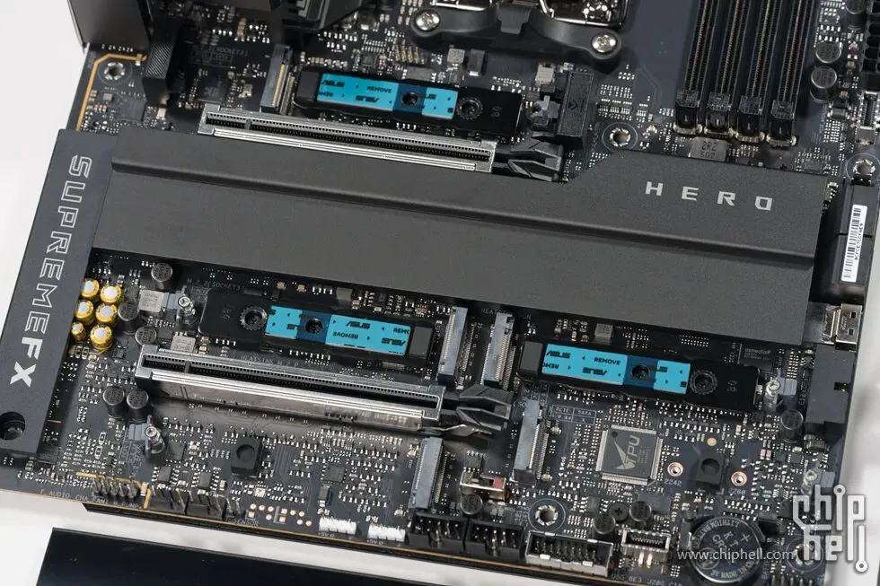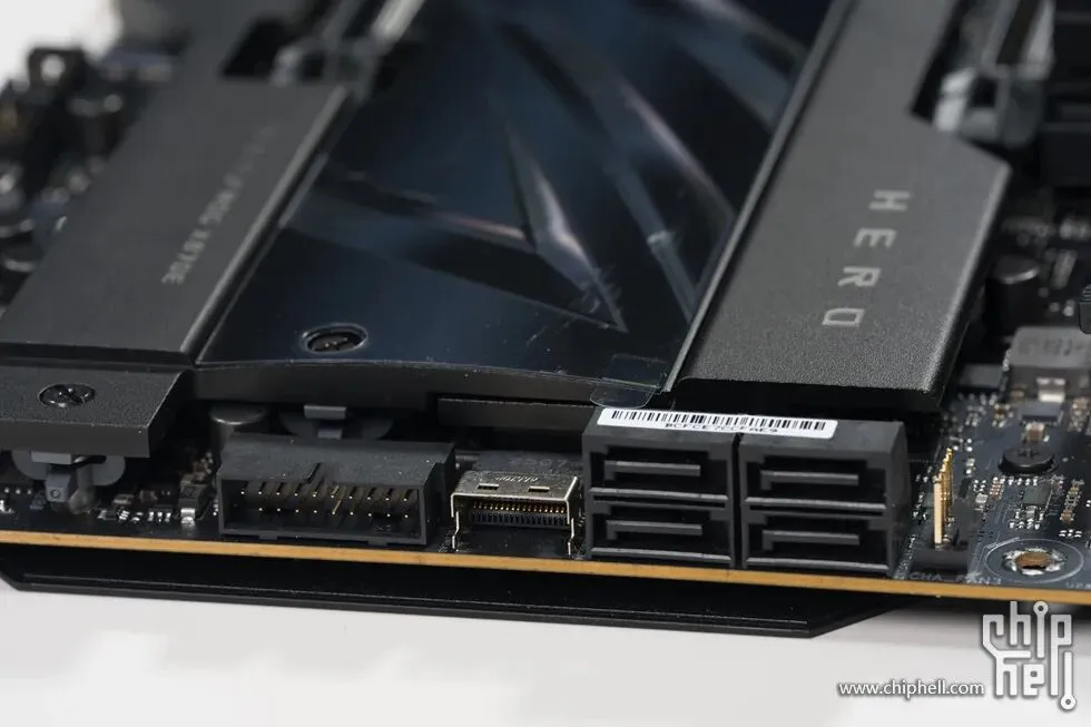 主板下半部特写,拥有大面积覆盖金属散热装甲