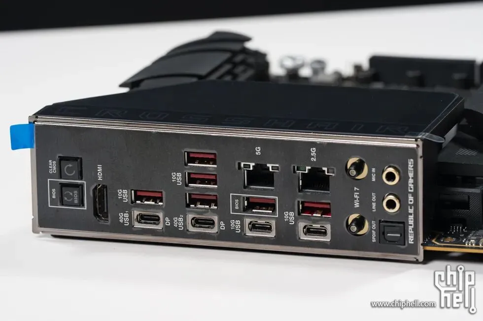 主板IO接口特写,提供十分强大的接口配置:2 x USB4 (40Gbps) 接口8 x USB 10Gbps 接口(6 x Type-A + 2 x USB Type-C)1 x HDMI 接口1 x Wi-Fi 71 x Intel 2.5Gb 有线网卡1 x Realtek 5Gb 有线网卡2 x 镀金音频插孔1 x S/PDIF 光纤数字音频接针1 x BIOS FlashBack 按钮1 x Clear CMOS 按钮