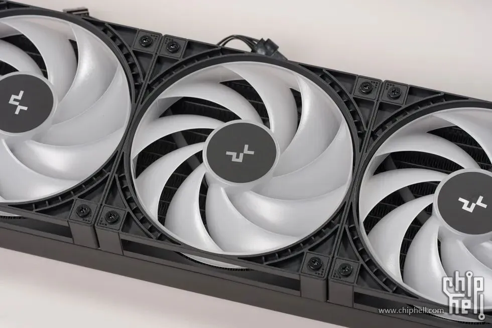 冷排特写,冰暴360Pro水冷系统搭载DeepCool专利防漏液科技。内置压力动态平衡阀实时调节系统内压,当内部压力超过环境大气压时自动泄压,显著延长散热器寿命并降低漏液风险