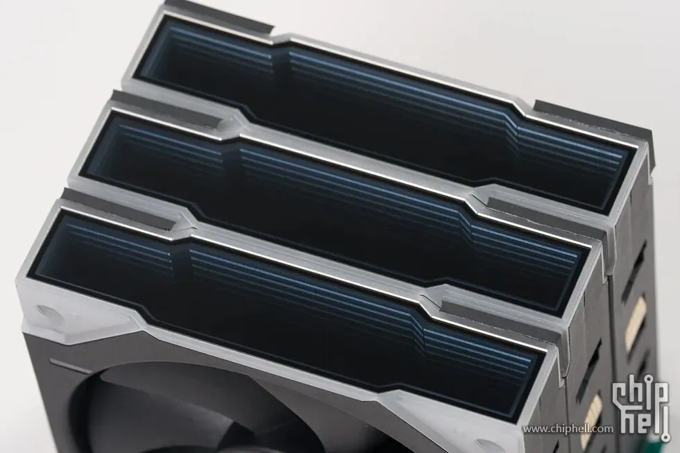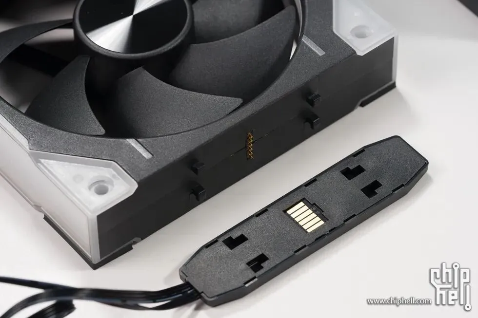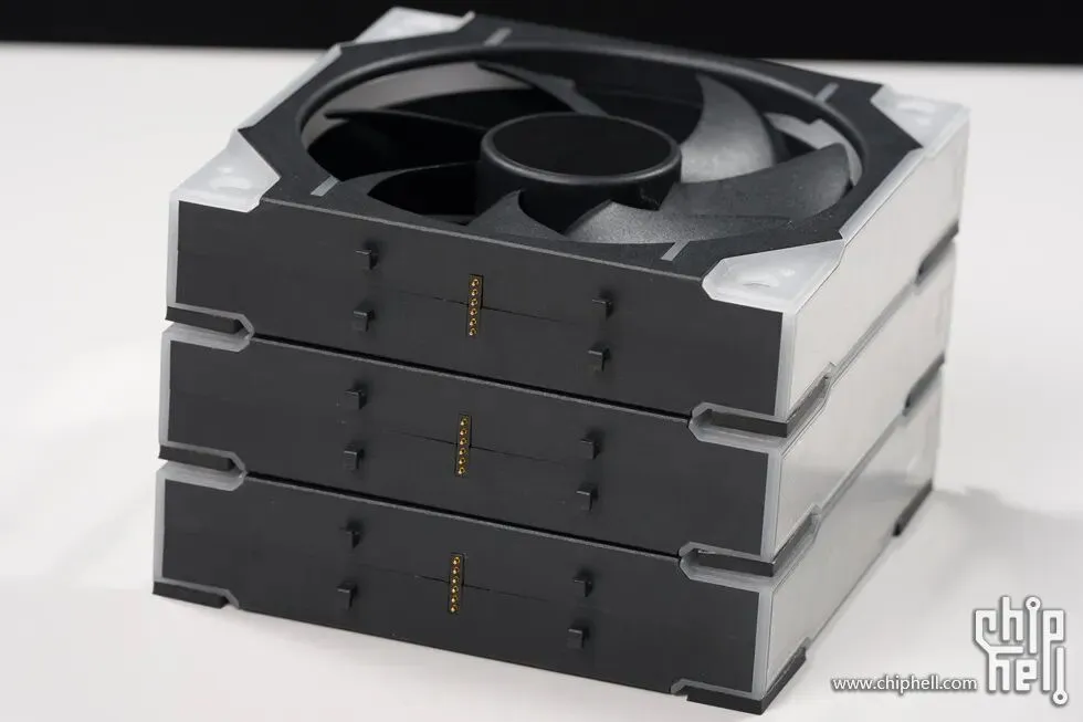 风扇之间为镀金触点连接器,通过免螺丝卡扣锁止