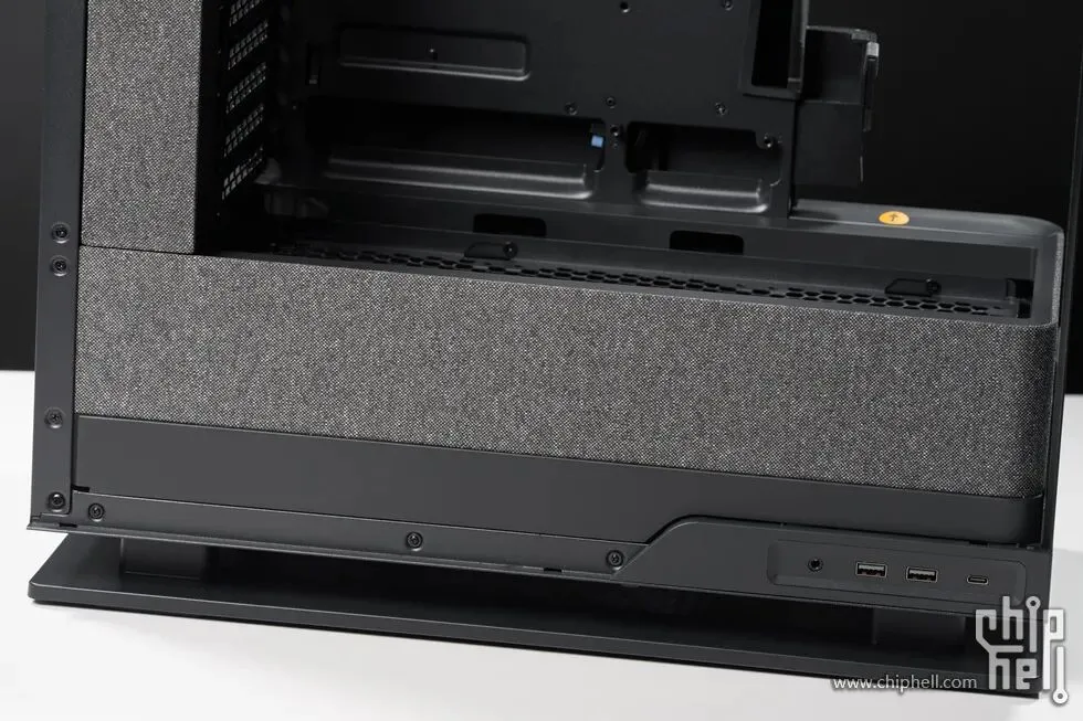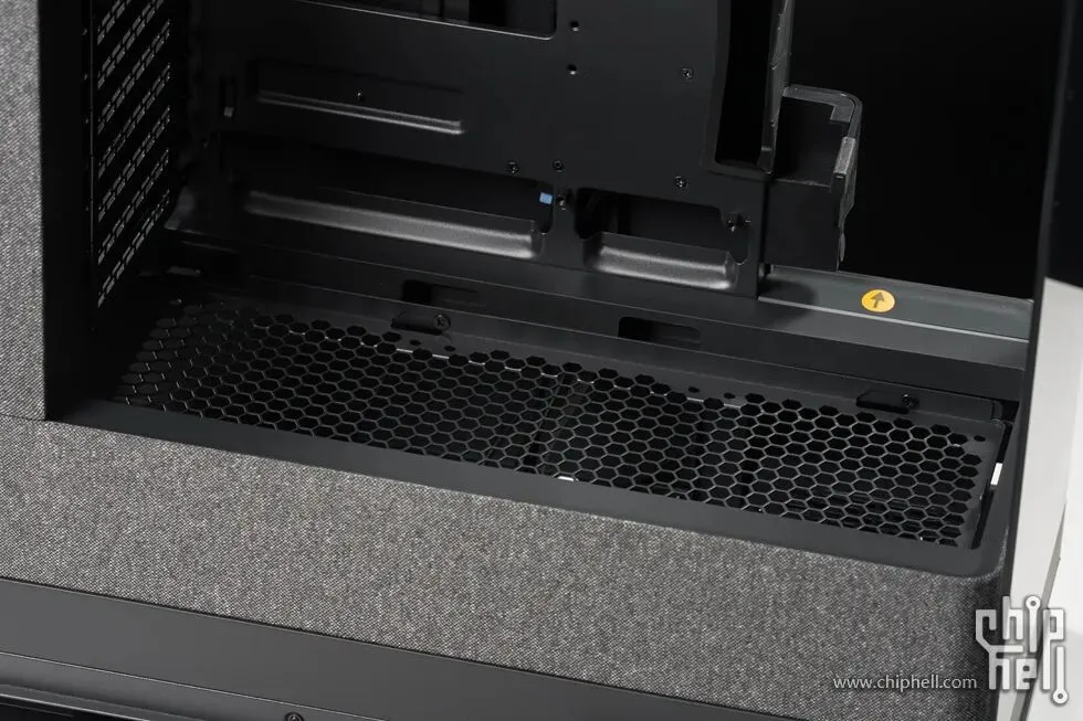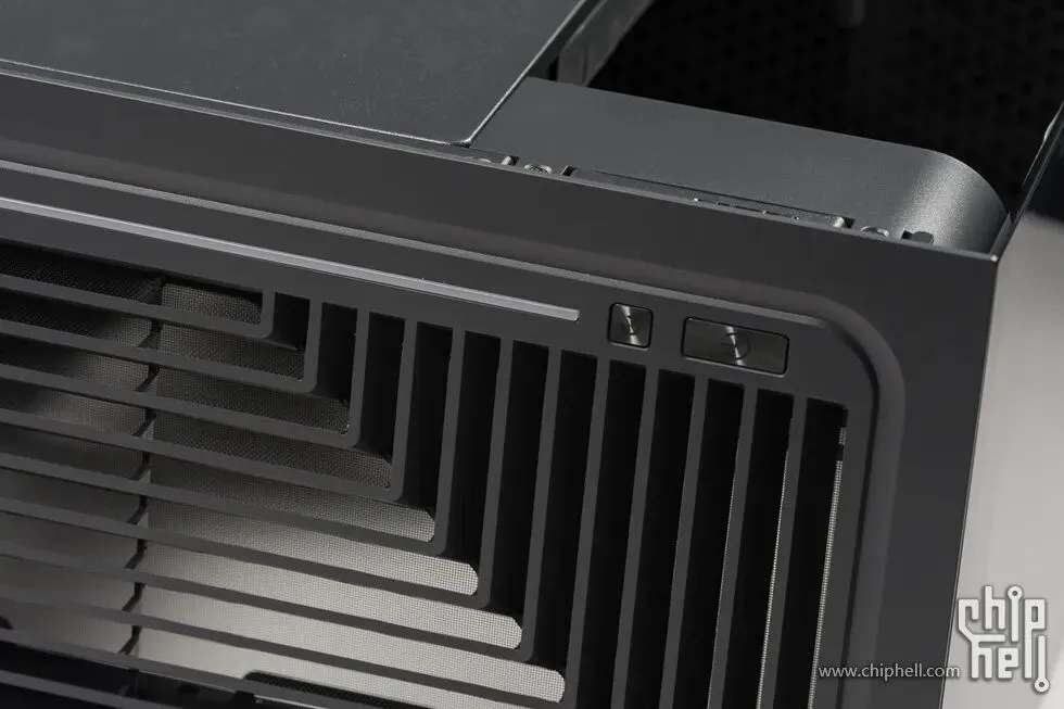 顶部为条状不规格格栅设计网板,顶部可装3个120mm以及360冷排,同样为嵌入设计,支架也可拆出方便安装,但需要注意的是因支架设计原因,如果使用冷排带有注水孔的水冷,水管方向只能朝尾部