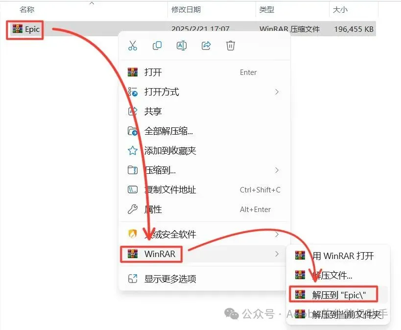 1.打开下载的Epic安装包,鼠标右击压缩包选择【解压到 “Epic\”】。