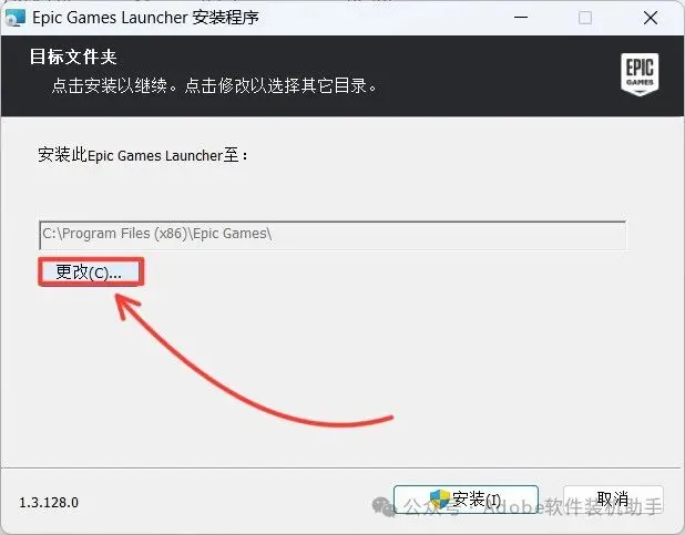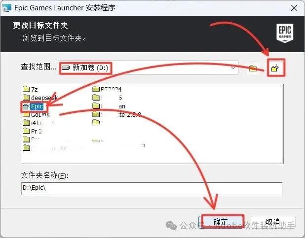 5.修改软件安装路径,在D盘新建一个“Epic”文件夹(安装路径中不要有中文),点击【确定】。