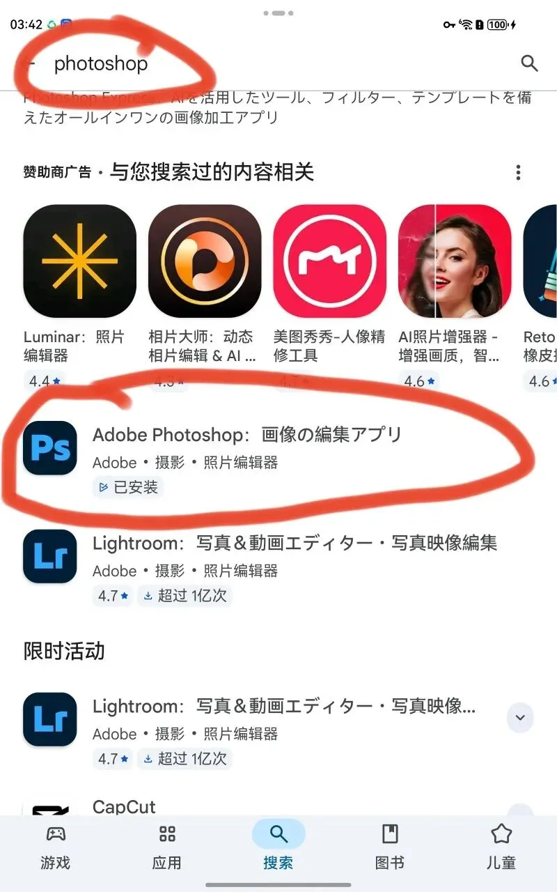 第五步:打开谷歌商店步,在搜索框中输入Photoshop并进行搜索