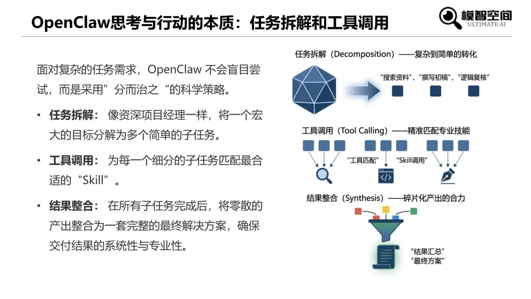 - 工作逻辑:遵循感知→思考→行动→记忆闭环,自主拆解任务、调用工具并整合结果。