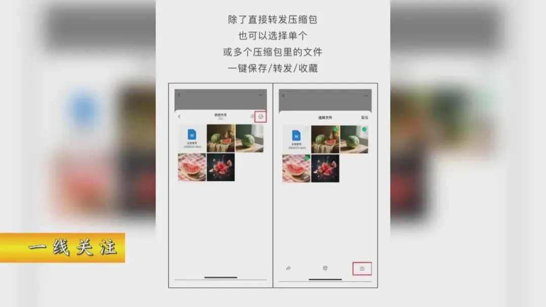 用户只需在微信中点击压缩包后,选择“预览”选项,就能直接查看压缩包内的所有文件。无论是文档、图片还是其他格式的文件,都能快速打开浏览。同时,预览界面还支持视图切换,方便用户快速定位所需内容;还可以单独勾选单个或多个文件,进行保存、转发、收藏等操作,无需下载整个压缩包,大大提升了办公、学习和日常沟通的效率。