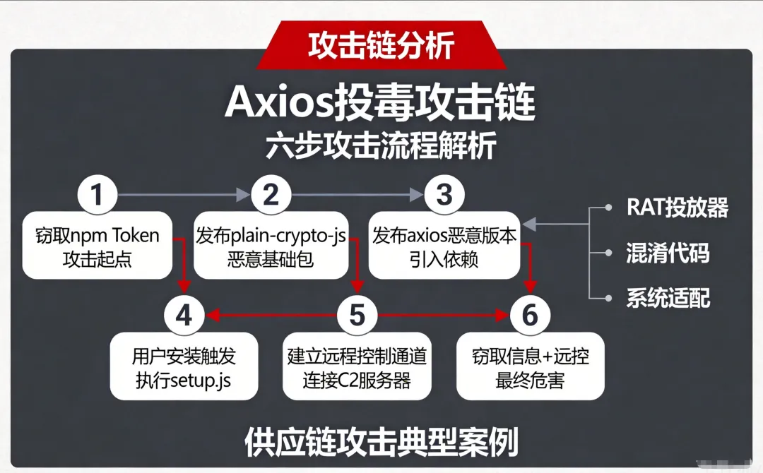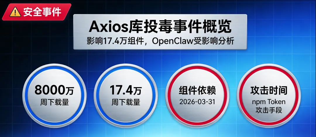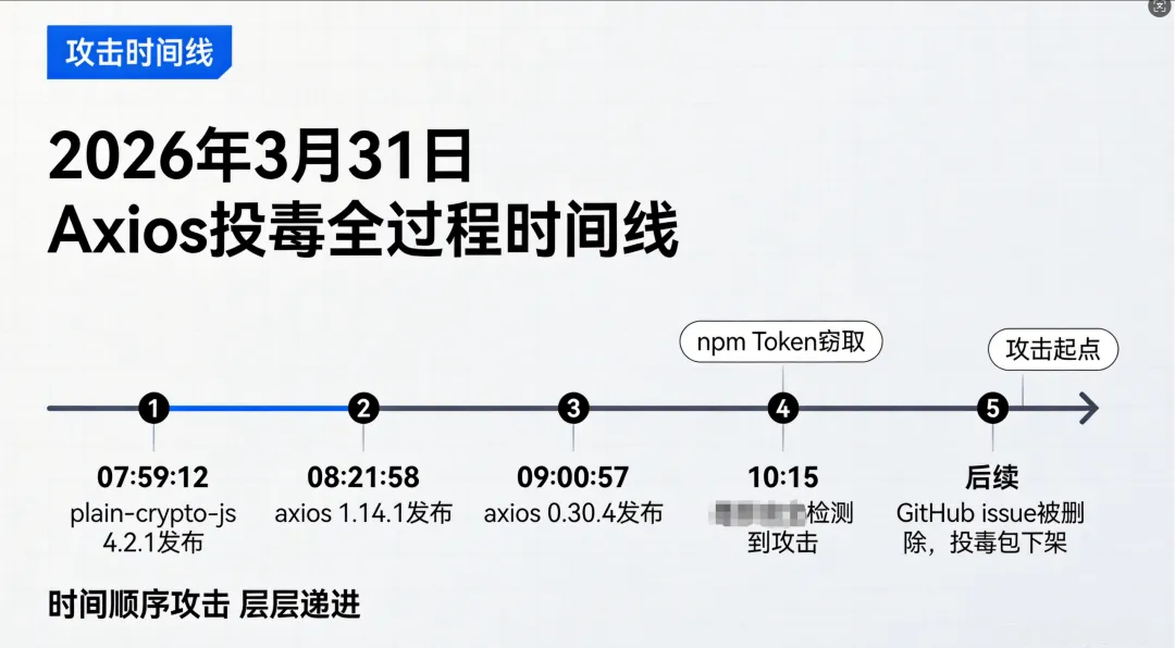 2026年3月31日,JavaScript生态中最核心的HTTP客户端库Axios在npm仓库遭遇供应链攻击。攻击者利用被盗的维护者账号发布了恶意版本axios@1.14.1和axios@0.30.4,通过依赖链污染影响全球开发者。