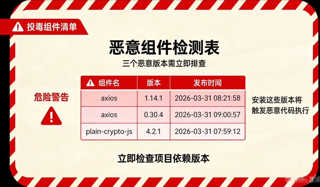 •受影响版本:axios@1.14.1、axios@0.30.4