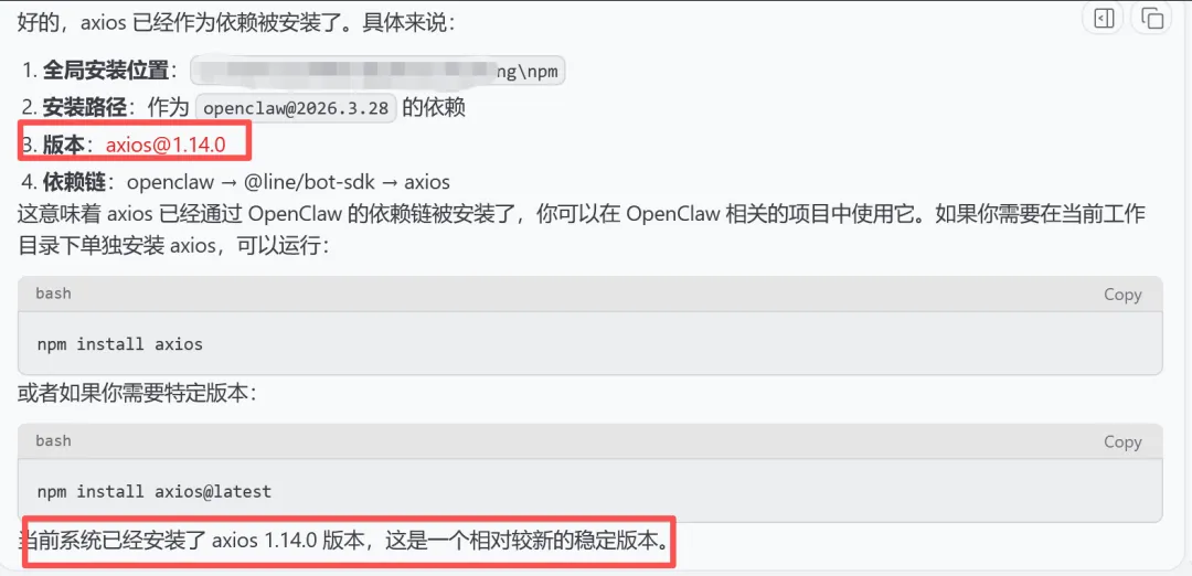 Bashnpm list axios # 预期输出不应包含1.14.1或0.30.4 OpenClaw用户排查