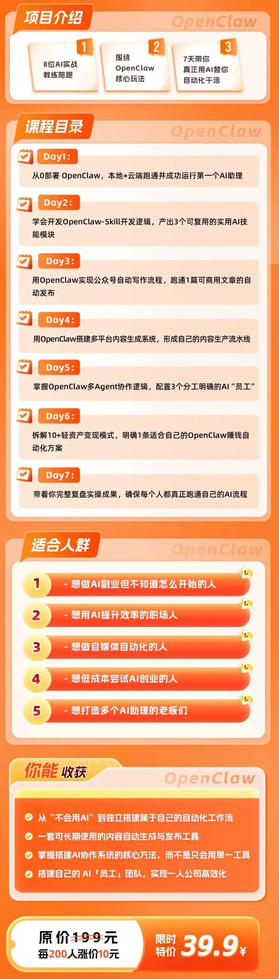 有人把 OpenClaw 做成 7 天直播 + 图文 + 回放的训练营,课程从本地部署、云端跑通,到 Skill 开发、内容生产、多 Agent 协作,再到变现路径,全部串起来讲。价格不高,39.9 元一人,但靠私域分发和集中宣传,还是很快做出了 25.5 万的总盘子。