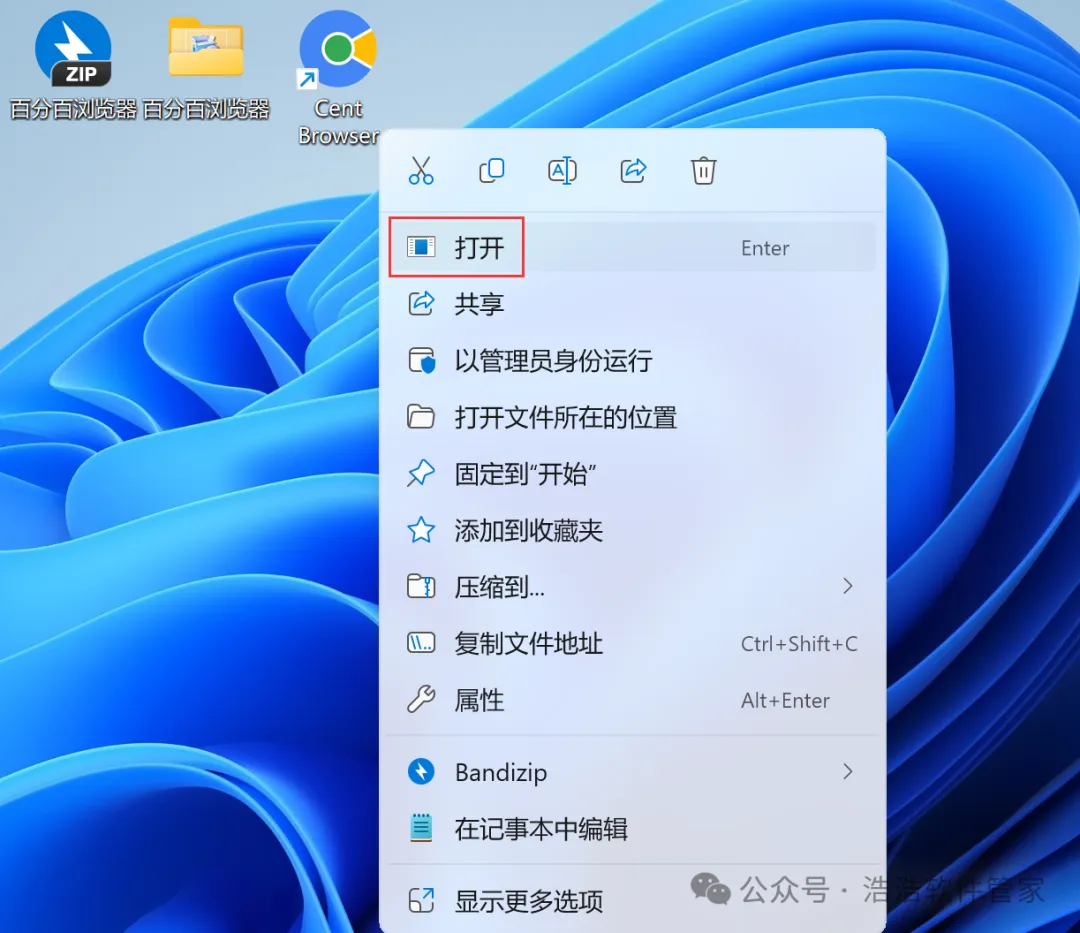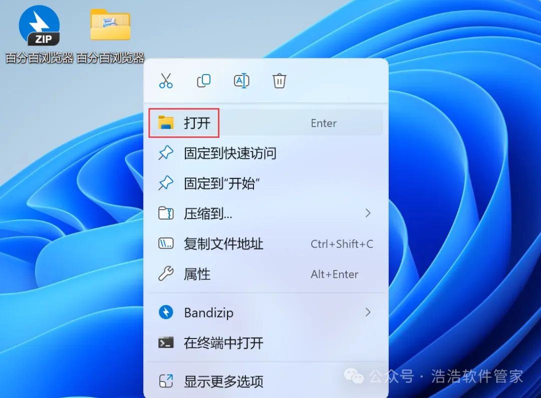 7、回到桌面,右键桌面上的【百分百浏览器软件图标】,点击【打开】