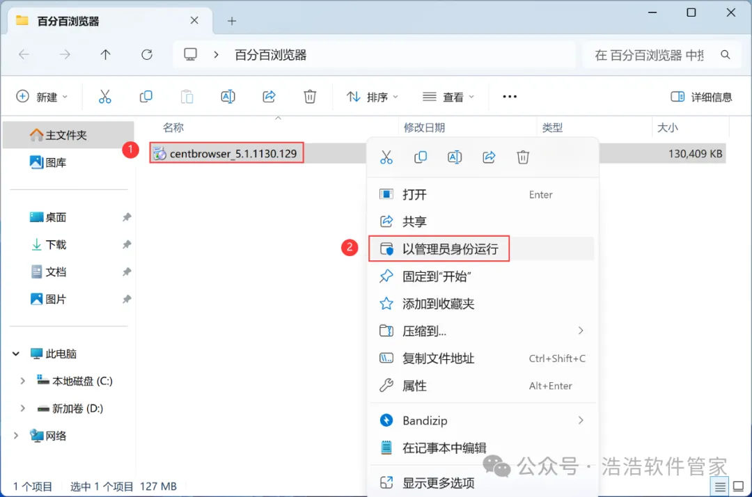 3、找到【百分百浏览器】应用程序,右键选择【以管理员身份运行】它