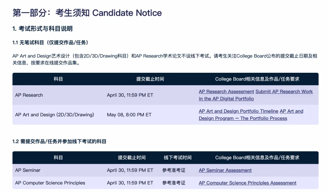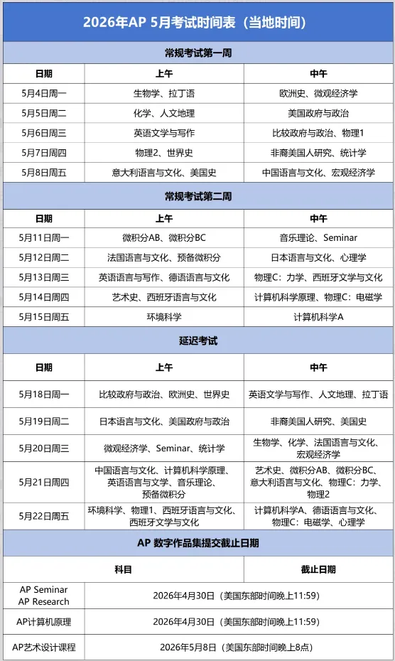 另外需要提醒参加AP Seminar、AP Research以及AP CSP的考生们, 提交作品的截止日期为美东时间2026年4月30日23:59。