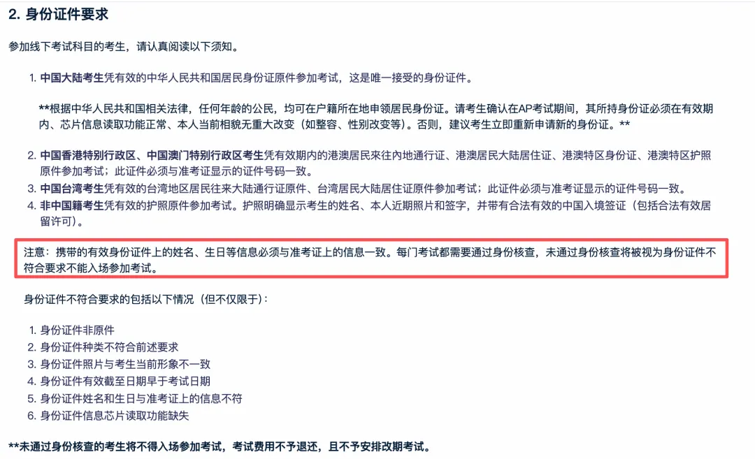2. 考生准考证、My AP 学生账户及本人身份证件上的信息须完全一致。如发现个人信息与报名证件信息不符,请于2026年4月12日前自行更新个人信息,并重新下载打印信息正确的准考证。逾期未更正导致准考证信息与身份证件信息不一致的,将无法参加考试,考试费用不予退还,亦不安排考试改期。