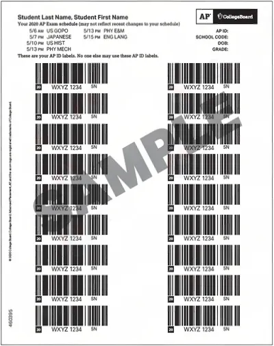 每个考生在参加所报第一门混合机考考试科目当日,监考人员将发放一张专属的AP ID条码贴纸(AP ID label sheet),考试时需要撕下一张条码贴纸并贴到答题册的指定位置。请妥善保存,每门混合机考考试都需携带该条码贴纸到考场,样例见下: