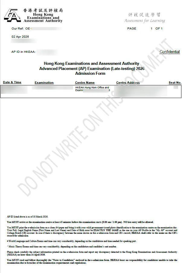 * 注意:仔细核对准考证上的信息,如发现差异,须尽快填写「2026AP考试查询表格」与考试局沟通修改。