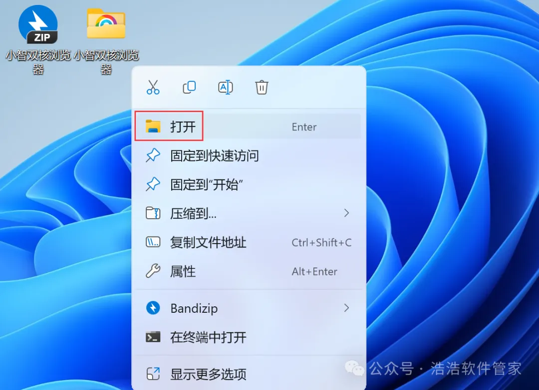 7、回到桌面,右键桌面上的【小智双核浏览器软件图标】,点击【打开】