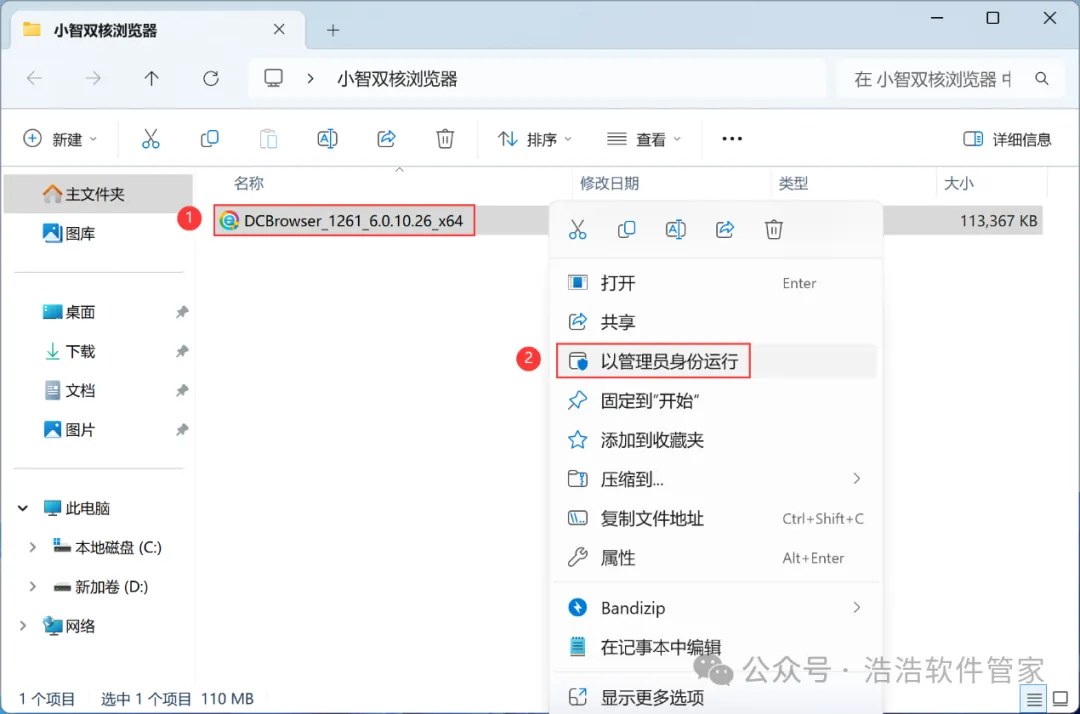 3、找到【小智双核浏览器】应用程序,右键选择【以管理员身份运行】它