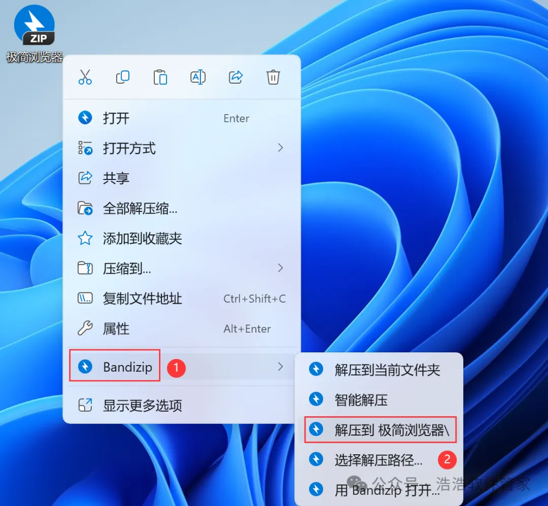 1、下载极简浏览器软件安装包到电脑上,右键选择【解压到极简浏览器\】
