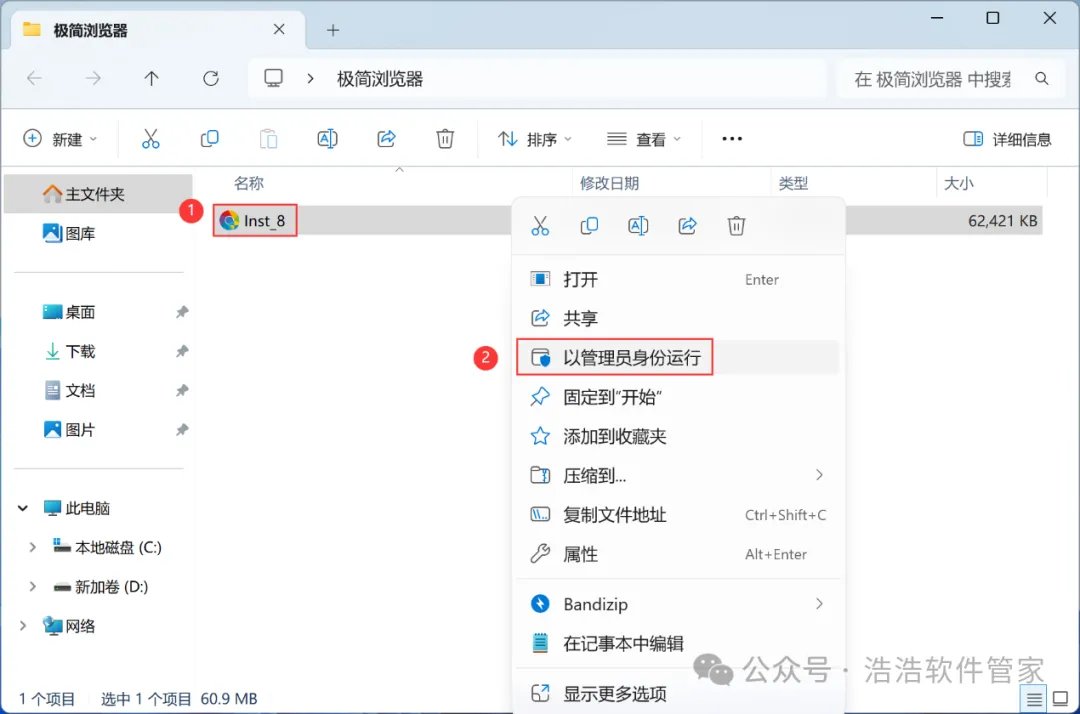 3、找到【极简浏览器】应用程序,右键选择【以管理员身份运行】它