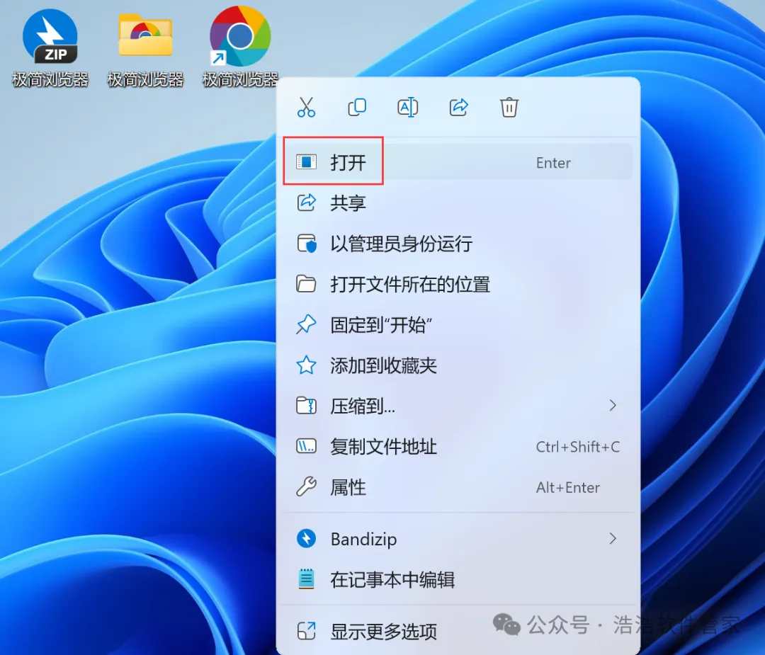 7、回到桌面,右键桌面上的【极简浏览器软件图标】,点击【打开】