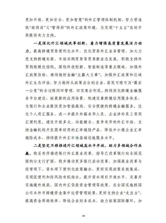 深化改革创新:提升跨境贸易便利化,支持跨境电商等新业态,围绕科创、智能制造强化外汇政策供给,优化个人和外籍人员用汇服务,降低中小微企业汇率避险成本;