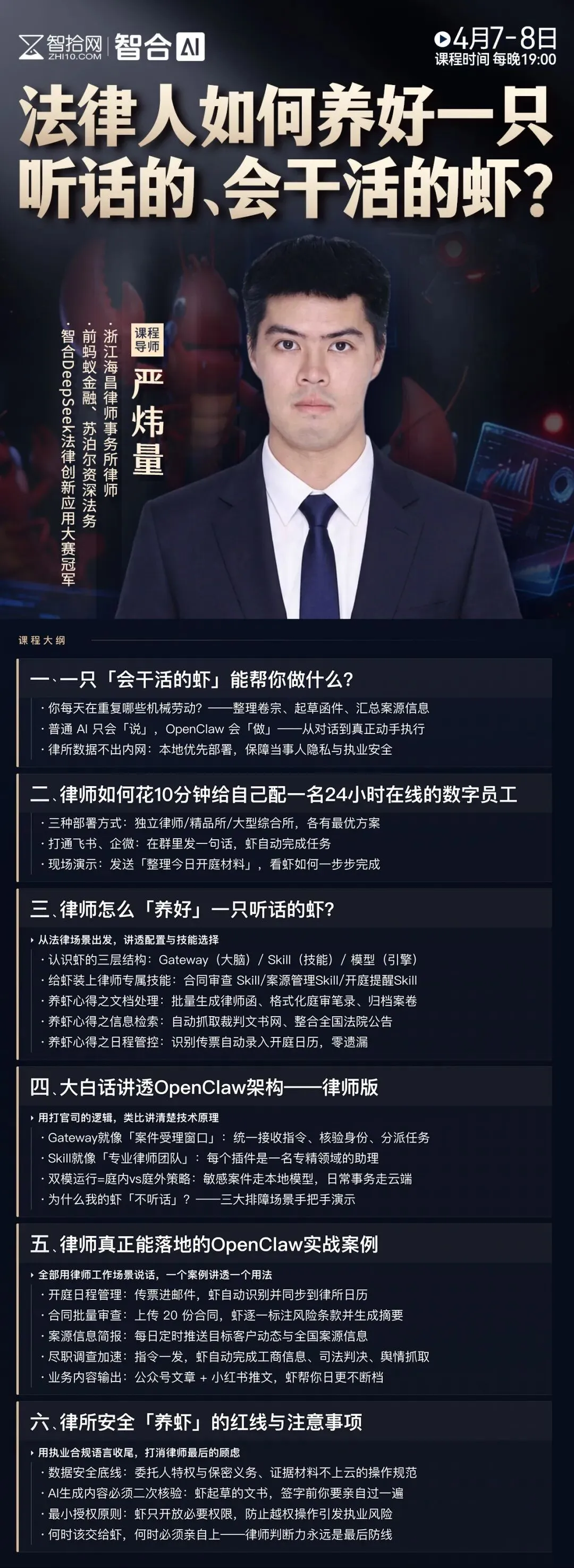 4月7-8日19:00,智拾网邀请到资深AI法律专家、浙江海昌律师事务所严炜量律师,手把手演示如何养好一只听话的、会干活的虾。
